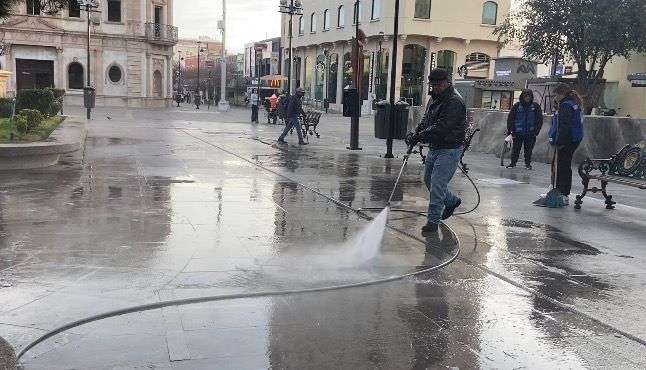 Desde temprana hora, los empleados municipales se dedicaron a lavar toda la plancha de adoquines que rodea la plaza, incluidas las áreas frente a la Catedral, garantizando así un espacio más limpio y agradable para visitantes y transeúntes.