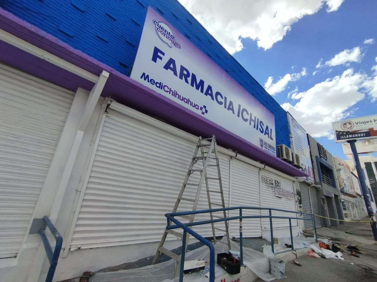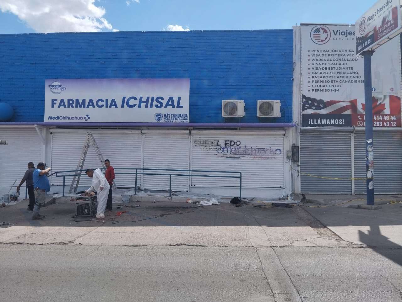 Chihuahua.- Personal de mantenimiento se presentó la tarde de este domingo en las instalaciones de la farmacia del Instituto Chihuahuense de la Salud (ICHISAL), ubicada en la Avenida Universidad, para realizar labores de limpieza y pintura en la fachada que resultó graffiteada durante la marcha del pasado 8 de marzo.
