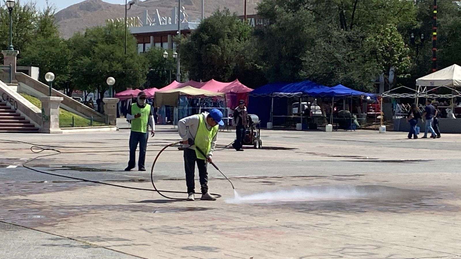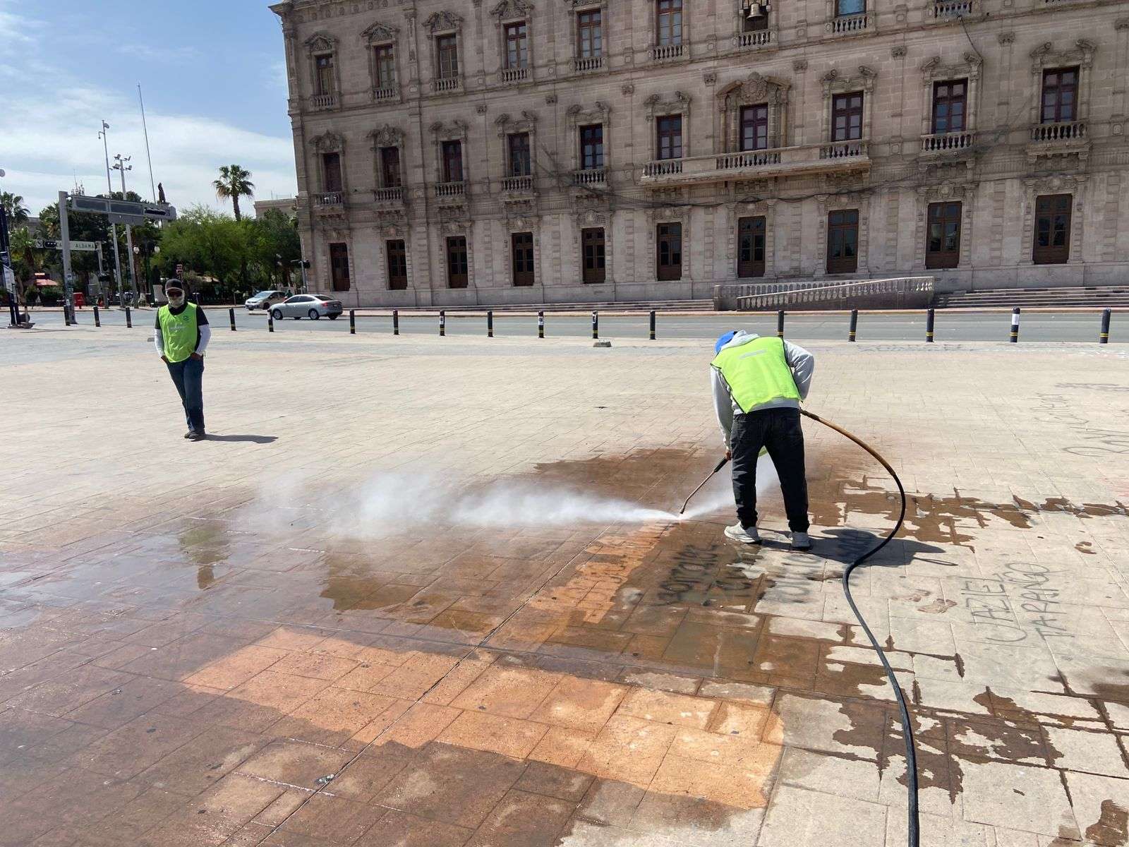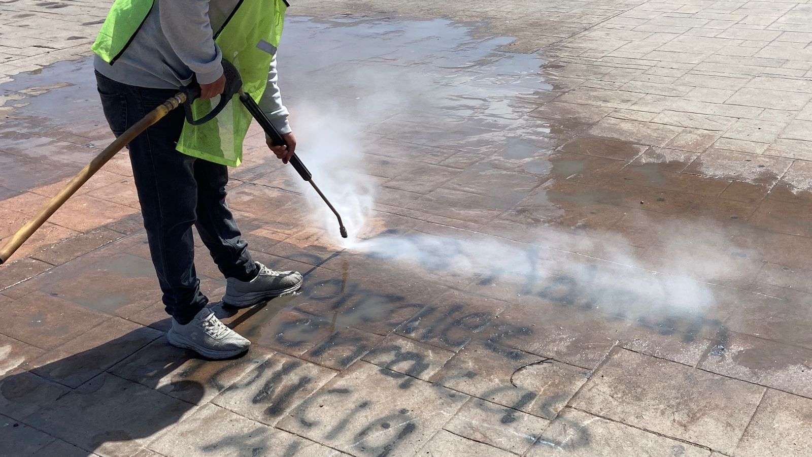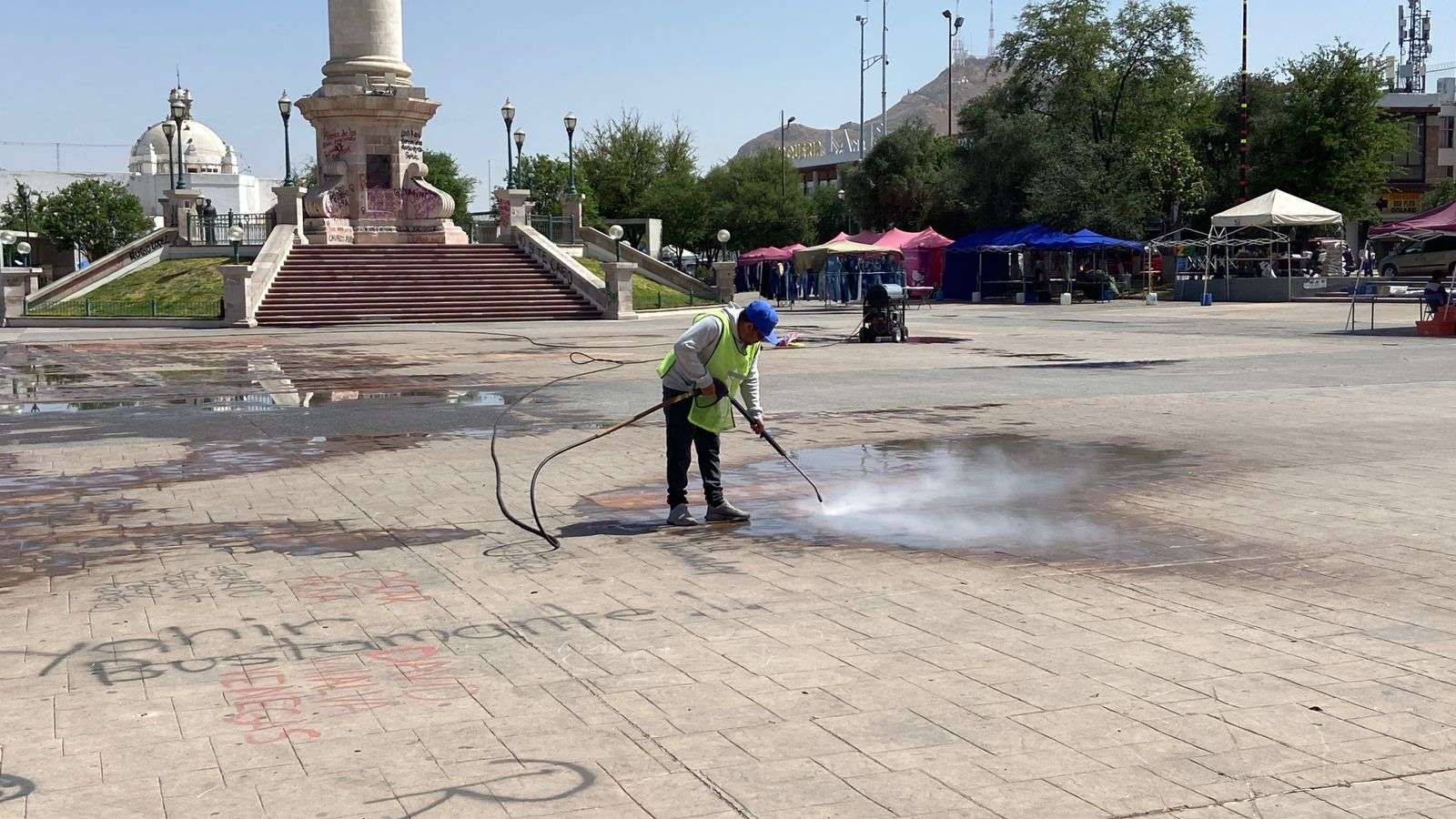 Chihuahua.- Trabajadores de la empresa Protec, se encargaron de limpiar los grafittis que aún se encuentran en la plancha de la Plaza del Ángel, esto después de la marcha del 8M.