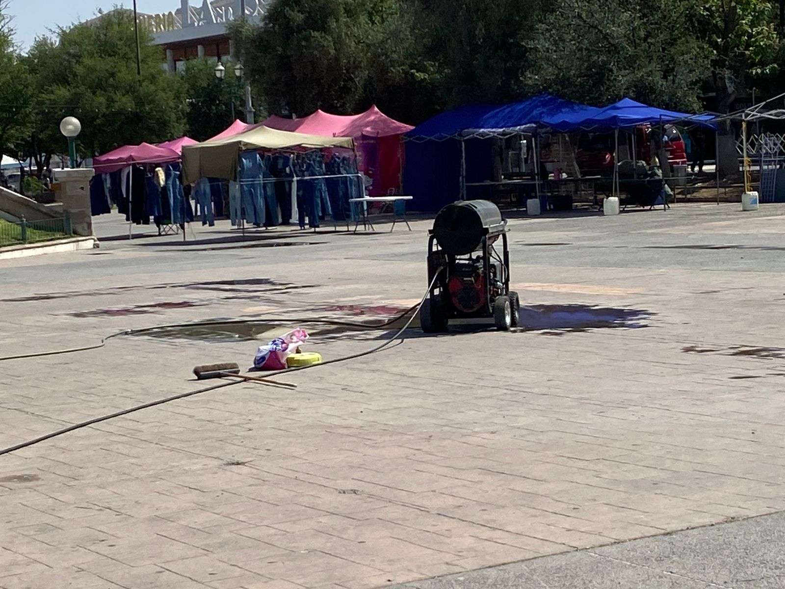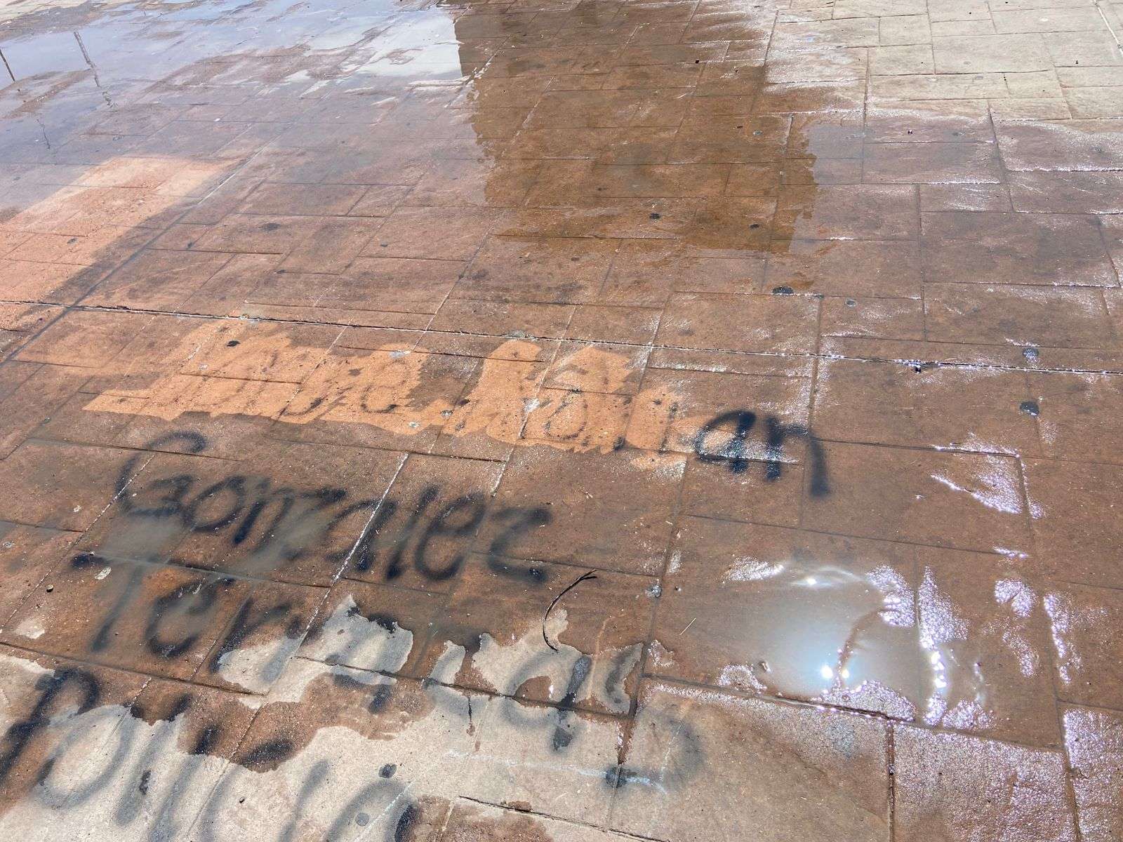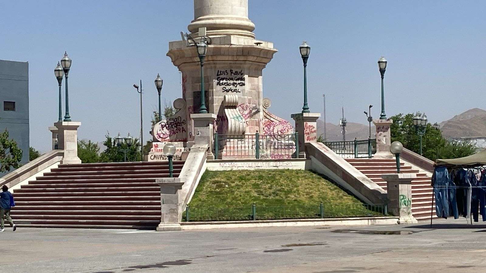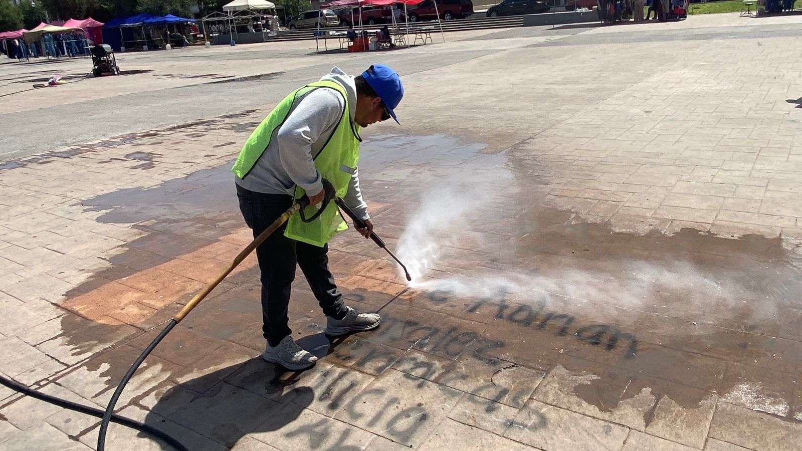 Chihuahua.- Trabajadores de la empresa Protec, se encargaron de limpiar los grafittis que aún se encuentran en la plancha de la Plaza del Ángel, esto después de la marcha del 8M.