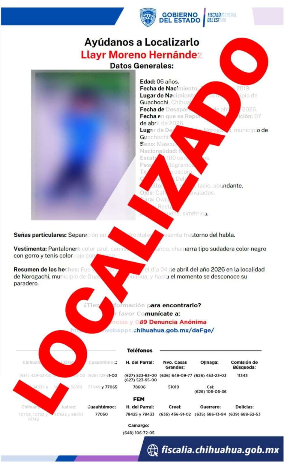 Guachochi, Chih. - Como resultado de la implementación de los protocolos de búsqueda coordinados por la Fiscalía de Distrito Zona Sur, se localizó sano y salvo a un niño de seis años de edad, que contaba con reporte de extravío interpuesto el 07 de abril del presente año en la localidad de Norogachi, en el municipio de Guachochi.