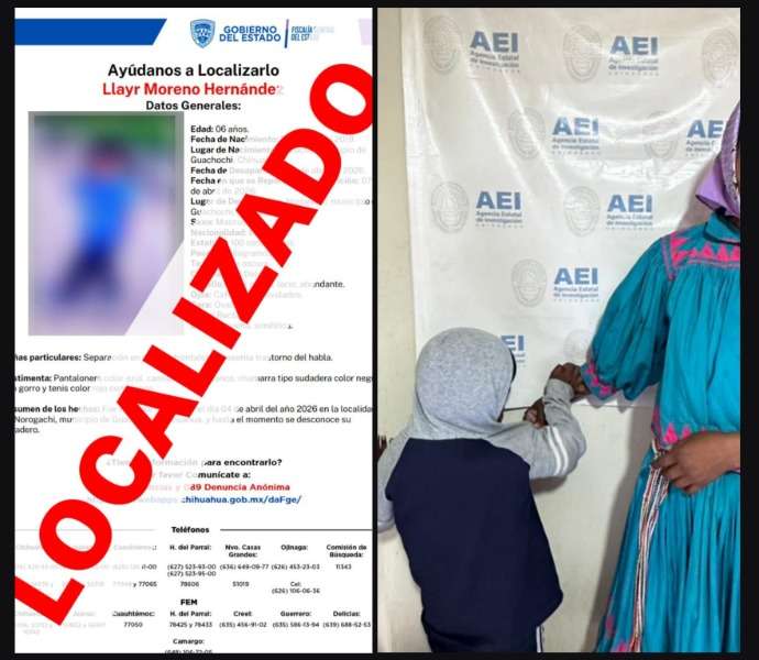 El pequeño, de iniciales LL.M.H., fue encontrado este sábado 11 de abril por elementos de la Agencia Estatal de Investigación (AEI) en la comunidad de Requeachi, en el citado municipio.