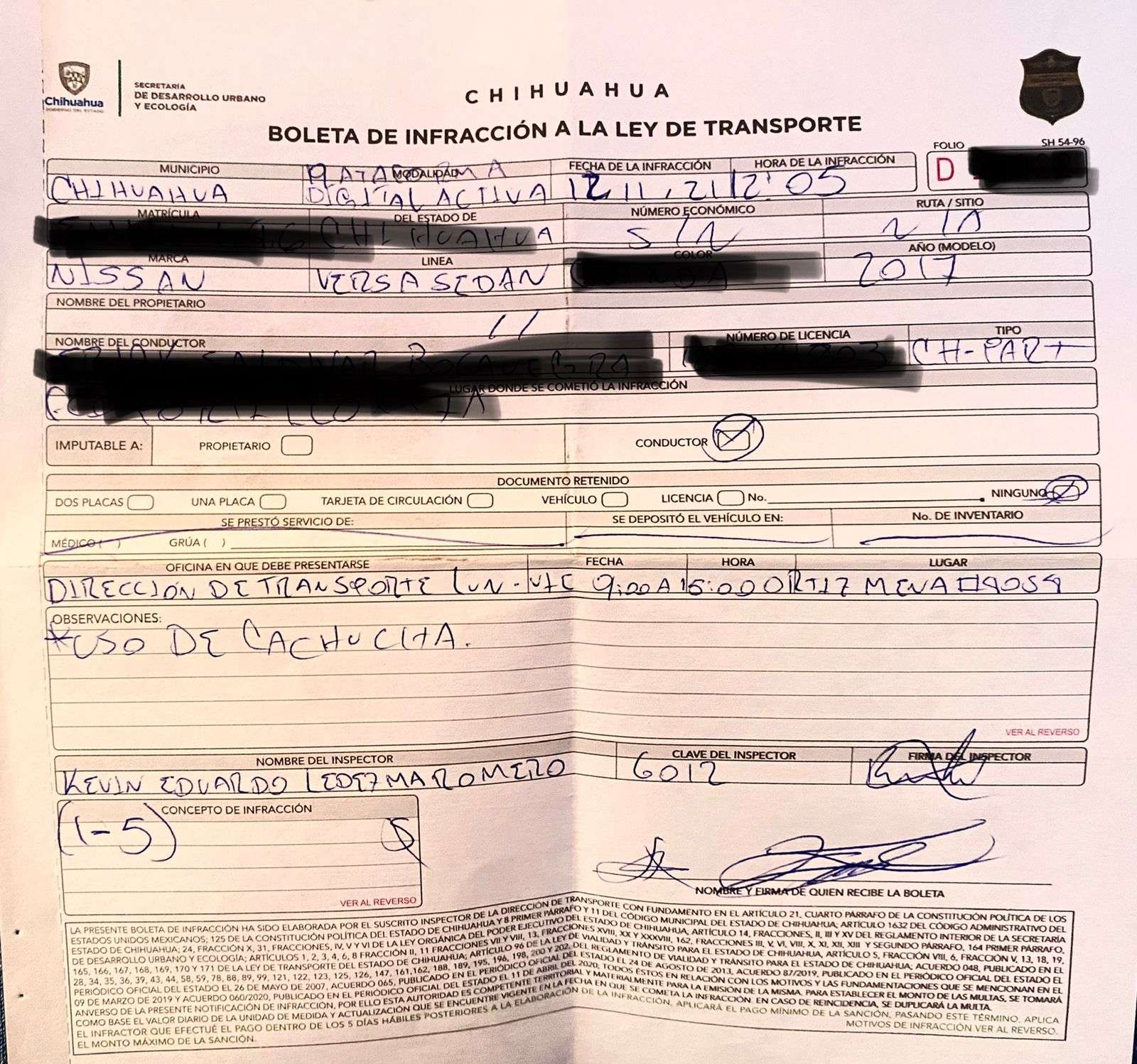 A este portal informativo llegó una boleta de infracción en la que un chofer de la plataforma DiDi fue multado por usar cachucha.