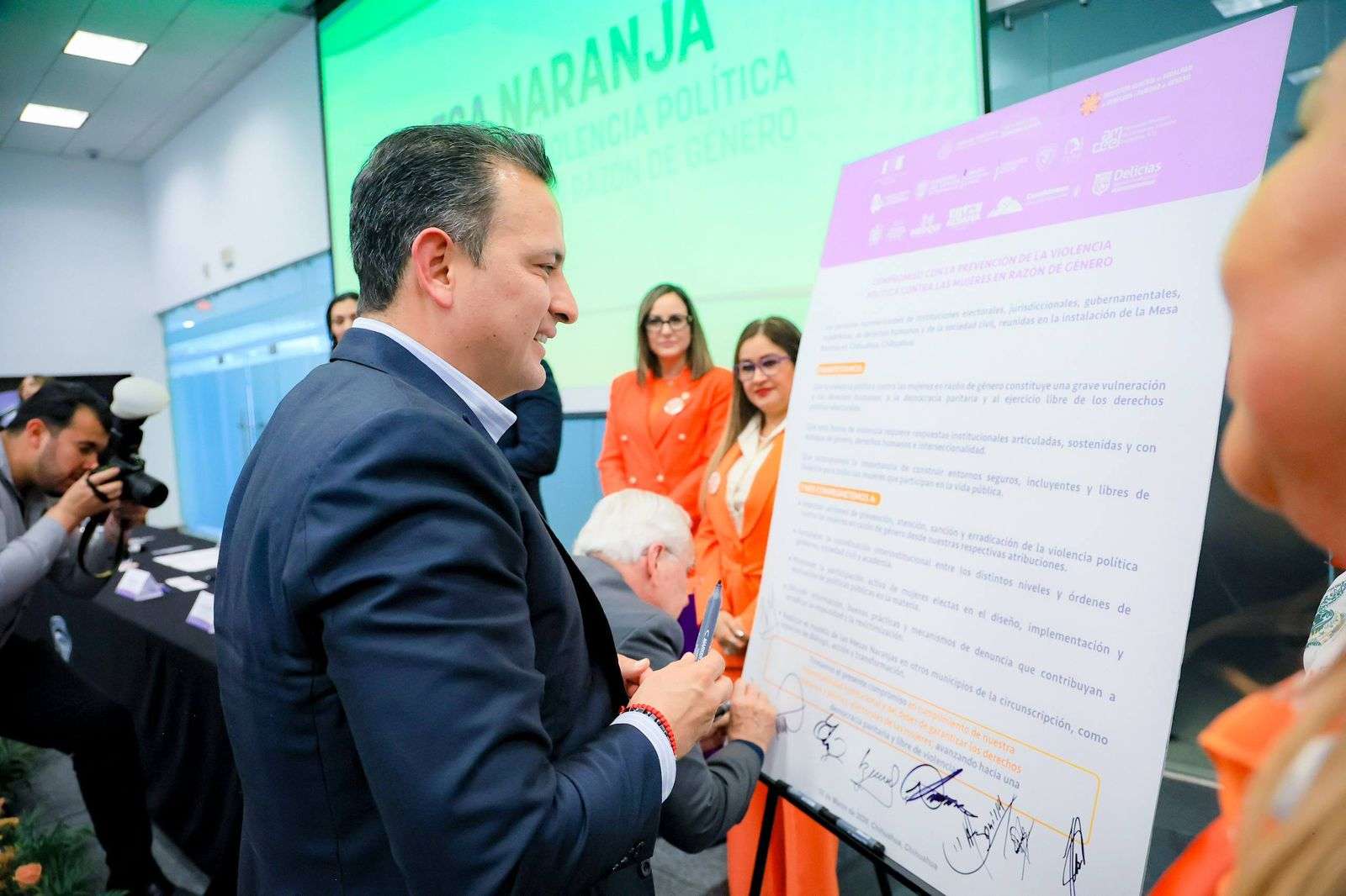 Chihuahua, Chih.- El alcalde Marco Bonilla participó en la firma para la instalación de la quinta Mesa Naranja, un organismo que reúne a diversas instituciones con el objetivo de trabajar de manera coordinada en la prevención, atención y erradicación de la violencia política contra las mujeres en razón de género.