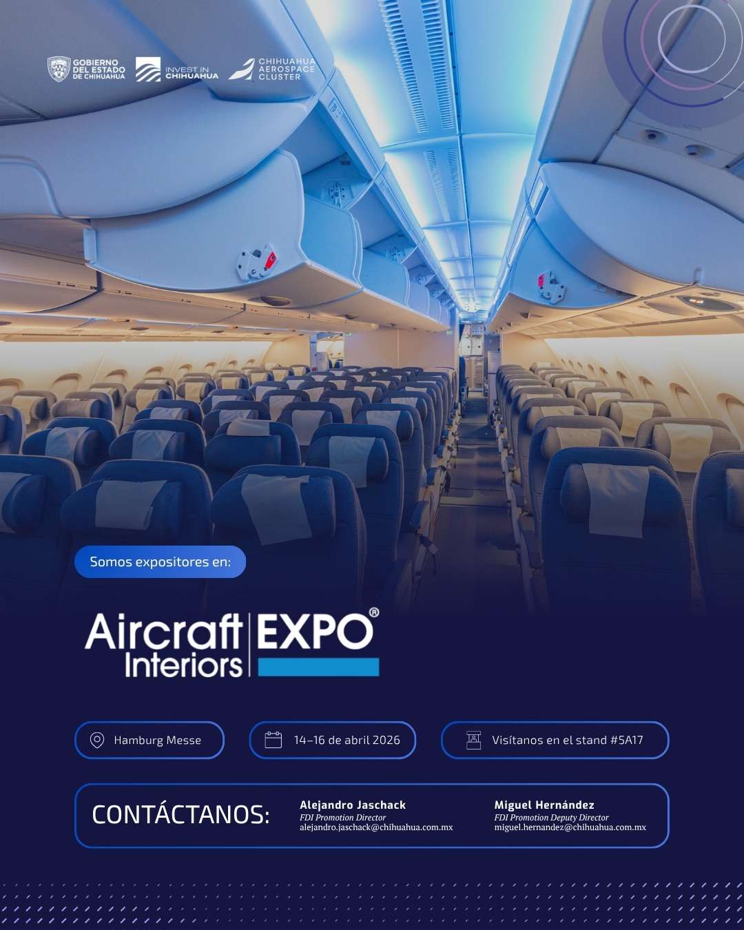Chihuahua.- El estado de Chihuahua participará en Aircraft Interiors Expo (AIX) 2026, que se llevará a cabo del 14 al 16 de abril en Hamburgo, Alemania, considerado el principal evento a nivel mundial enfocado en la innovación de interiores de aeronaves.