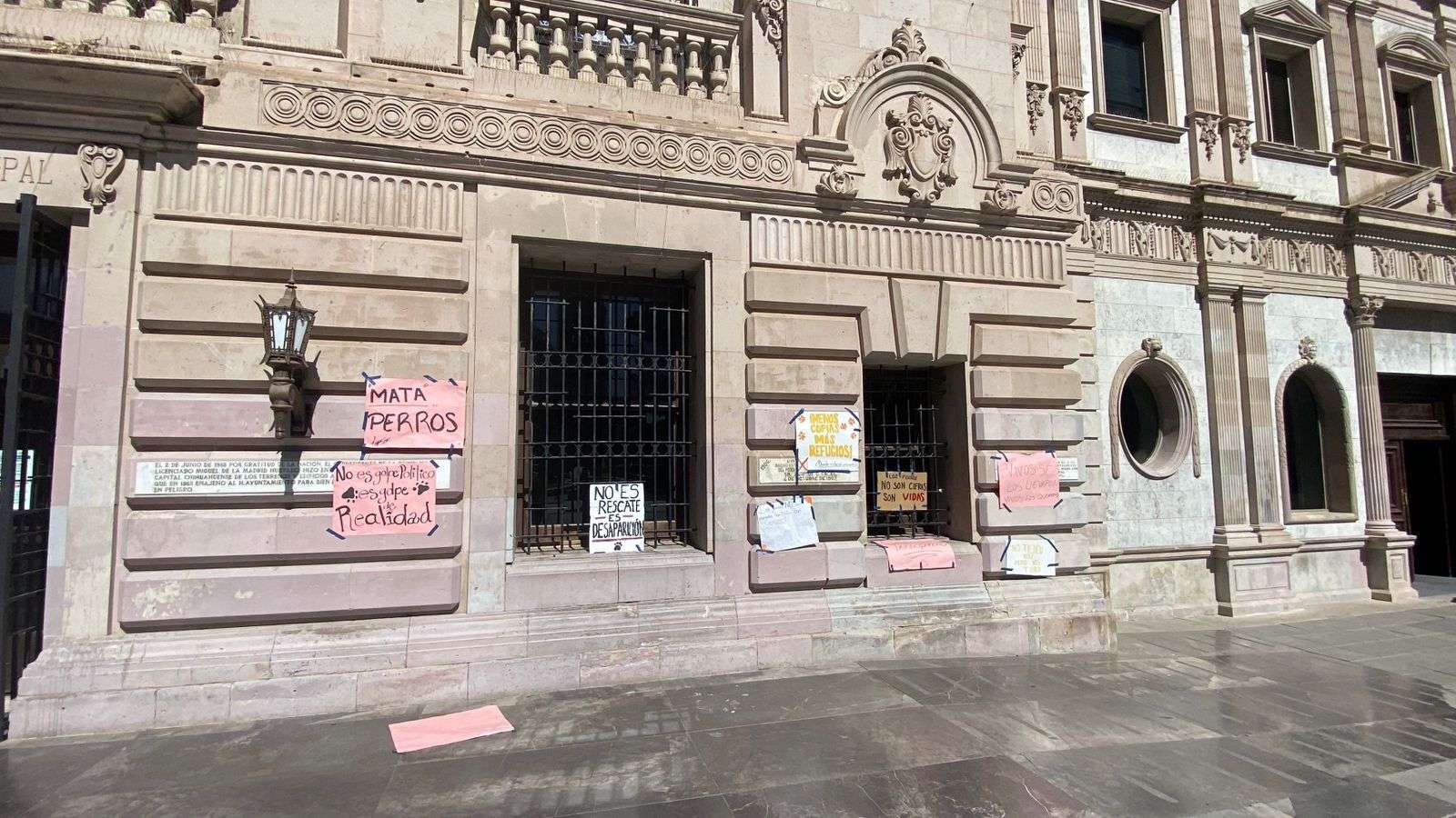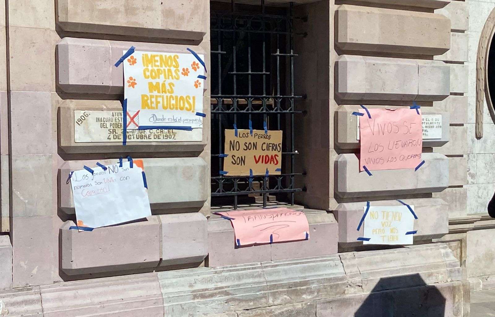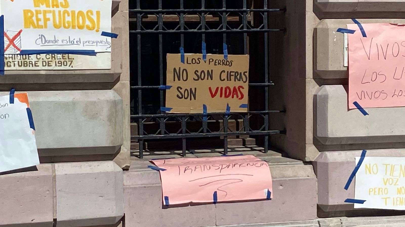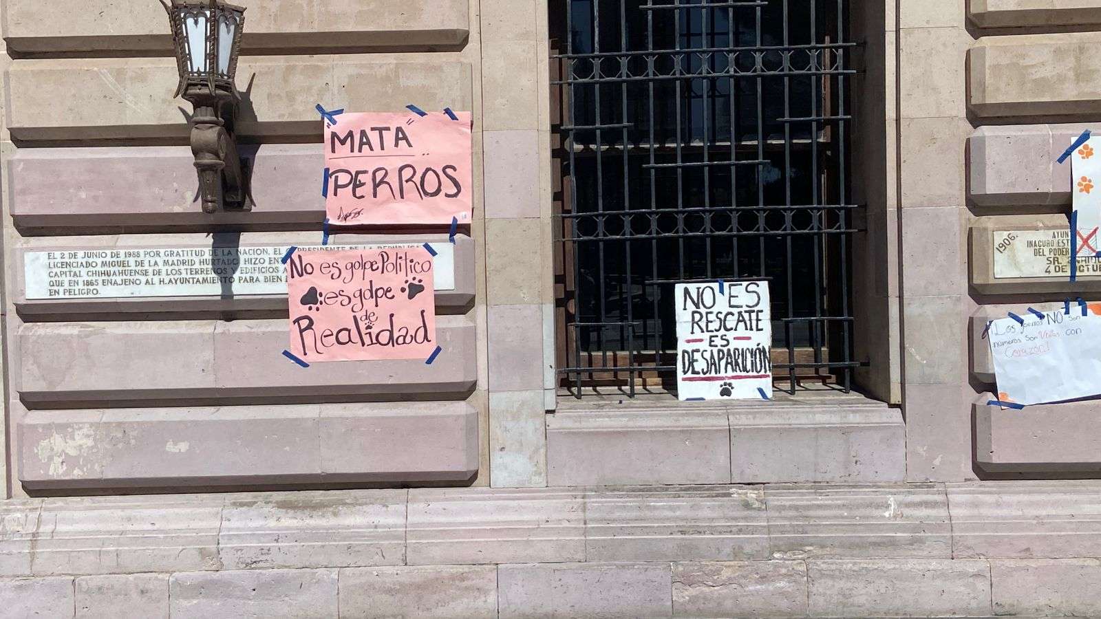 Chihuahua.- Integrantes de la asociación Cat Family colocaron pancartas en el edificio de la Presidencia Municipal como forma de protesta por las condiciones en las que, aseguran, se encuentran los perros en el albergue municipal.