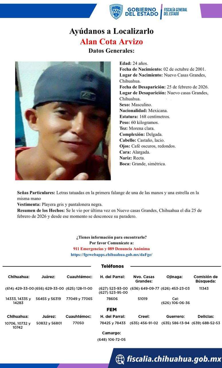 Autoridades y familiares solicitan el apoyo de la ciudadanía para localizar a Alan Cota Arvizo, quien fue visto por última vez el pasado 25 de febrero de 2026 en el municipio de Nuevo Casas Grandes. Desde esa fecha se desconoce su paradero.