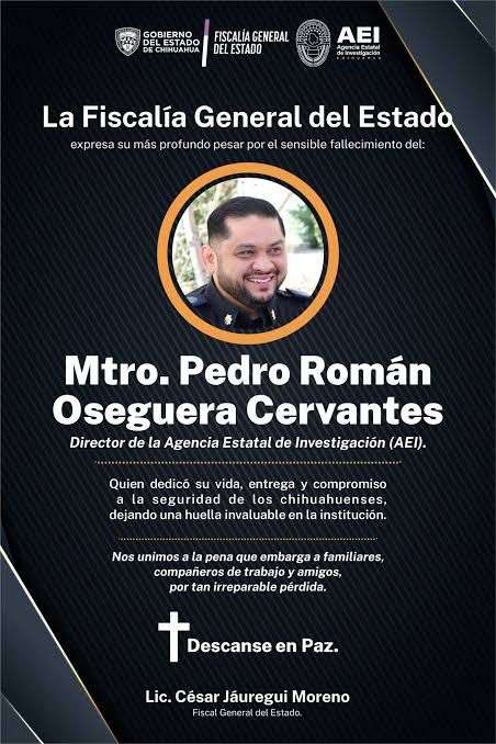 Chihuahua.- La Fiscalía General del Estado, dio a conocer que este lunes se llevará a cabo la ceremonia de honor en memoria del director de la Agencia Estatal de Investigaciones Pedro Román Oseguera Cervantes y del agente Manuel Genaro Méndez Montes, quienes perdieron la vida en cumplimiento de su deber.
