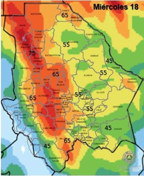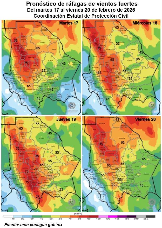 En cuanto al viento, se esperan velocidades de 15 a 25 kilómetros por hora, con ráfagas superiores a los 75 km/h en municipios del noroeste, mientras que en las regiones norte, centro y suroeste podrían rebasar los 65 km/h.