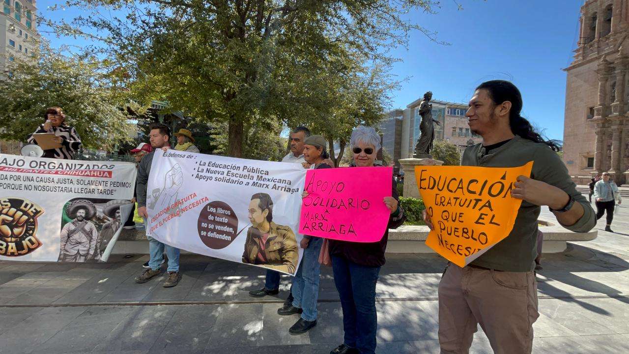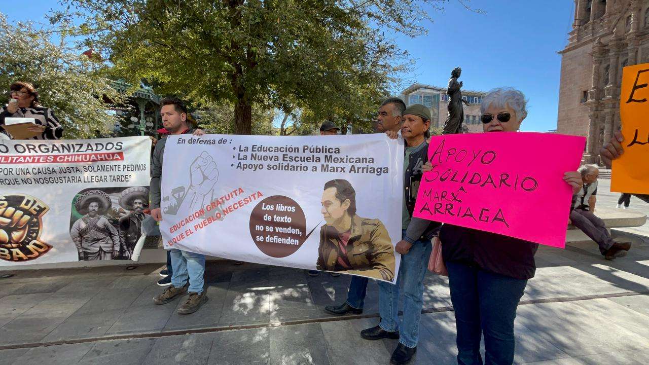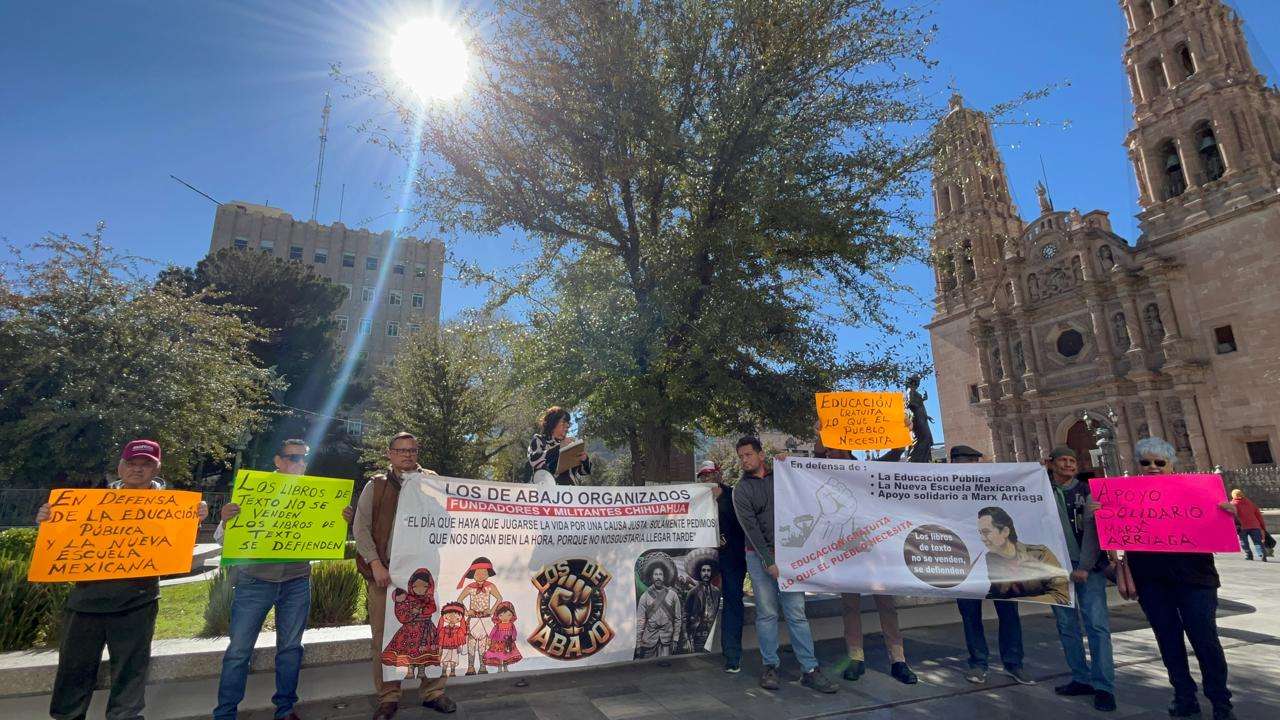 Chihuahua.- Frente a las instalaciones del Congreso del Estado, Rosalilia Cardona Muñoz, acompañada por integrantes de la agrupación civil "Los de Abajo", encabezó una protesta para manifestar su rechazo a la reciente remoción de Marx Arriaga Navarro como titular de la Dirección General de Materiales Educativos de la Secretaría de Educación Pública (SEP).