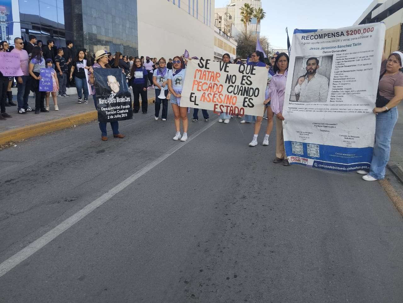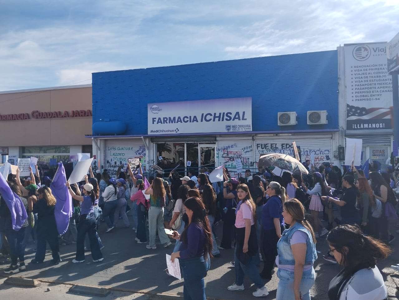Chihuahua, Chih.- Integrantes del bloque negro realizaron actos de vandalismo e intervenciones en inmuebles de la avenida Universidad durante la marcha del 8M. El contingente aprovechó las fachadas de la ruta para realizar denuncias públicas contra funcionarios y figuras políticas, cubriendo muros con nombres y reclamos de justicia.