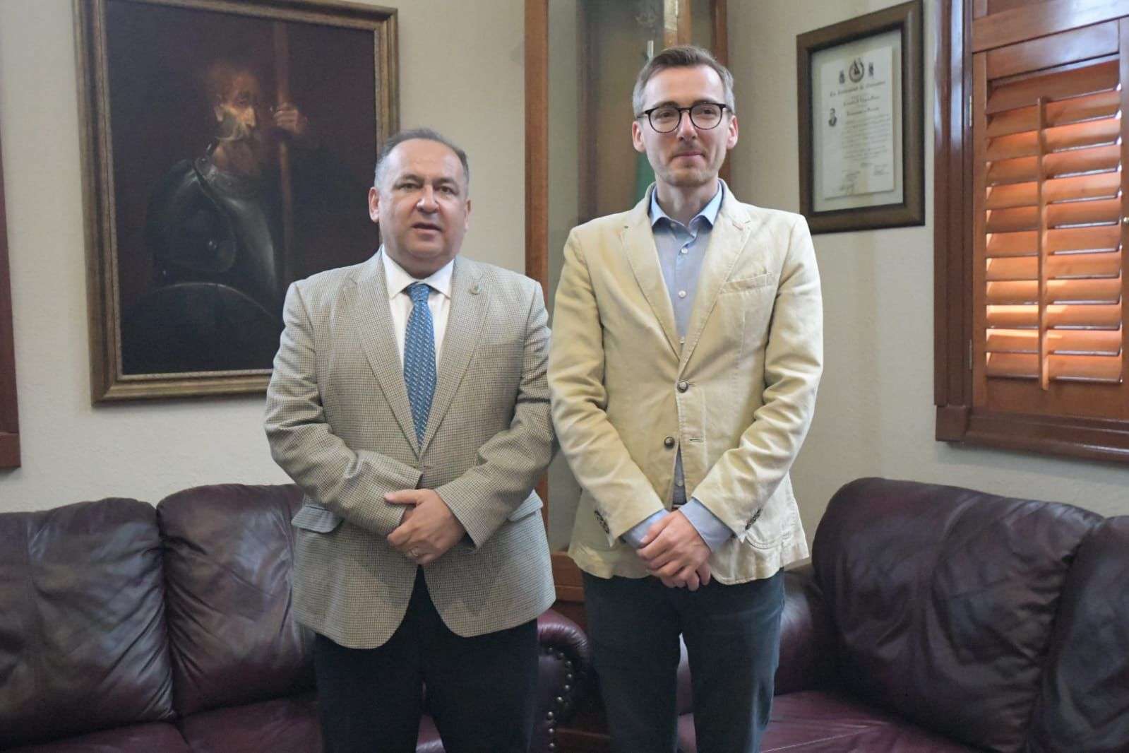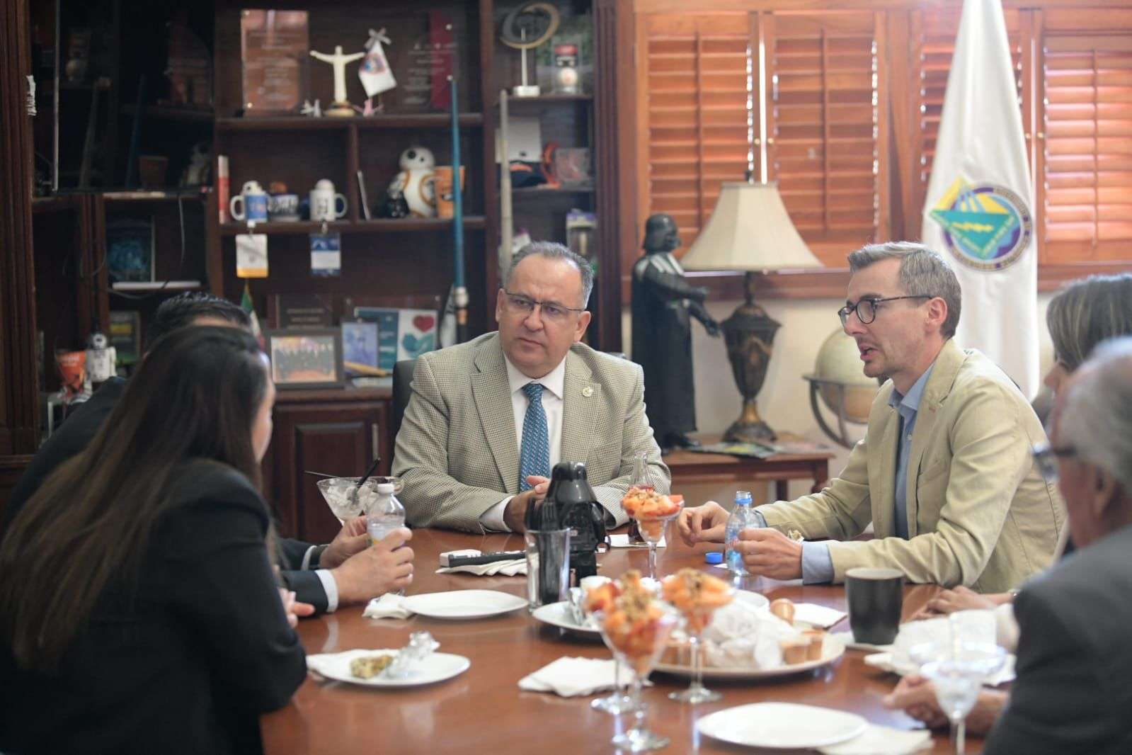 Chihuahua, Chih.- El rector de la Universidad Autónoma de chihuahua, maestro Luis Alfonso Rivera Campos, recibió en su despacho a Cirpian Fugel Werner, consejero de Asuntos Científicos y Económicos de la Embajada de Alemania en México, para reforzar la relación diplomática y académica entre la institución, así como ofrecer oportunidades laborales y de crecimiento en el país europeo.