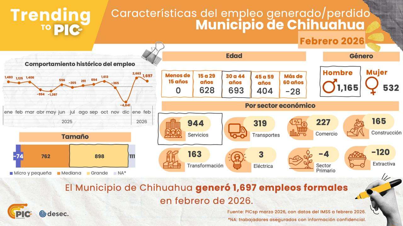 Tan solo en febrero, el municipio de Chihuahua generó mil 697 plazas laborales, siendo el sector servicios el que concentró la mayor creación de empleos con 944 puestos adicionales respecto al mes anterior. Por el contrario, la industria extractiva fue la que presentó la mayor disminución al registrar una caída de 120 plazas.