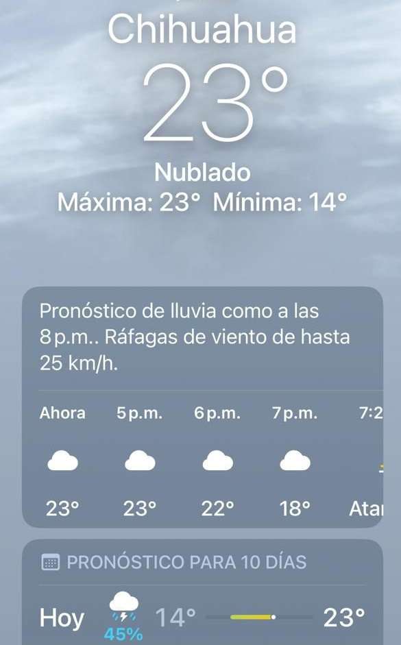 Chihuahua. - Un ambiente de fresco a frío se registró durante la tarde de este sábado en la capital, donde el termómetro marcó los 23 grados con una sensación térmica de apenas 20 grados debido a la presencia de viento.
