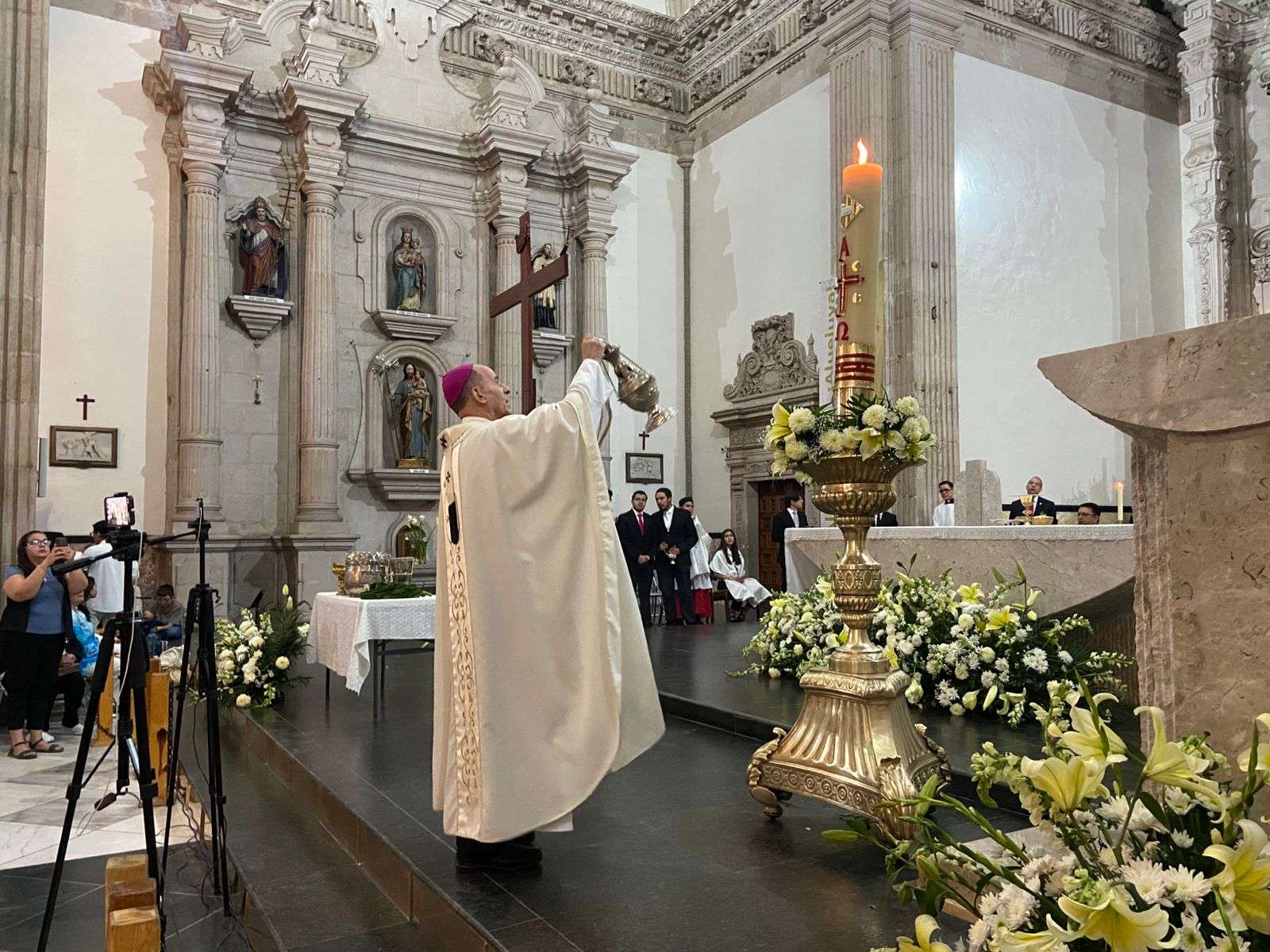 Todas las luces de la catedral se encendieron y así continuo el arzobispo Constancio Miranda con la misa de la Vigilia Pascual y se leyó el evangelio, no sin antes inciensarlo.