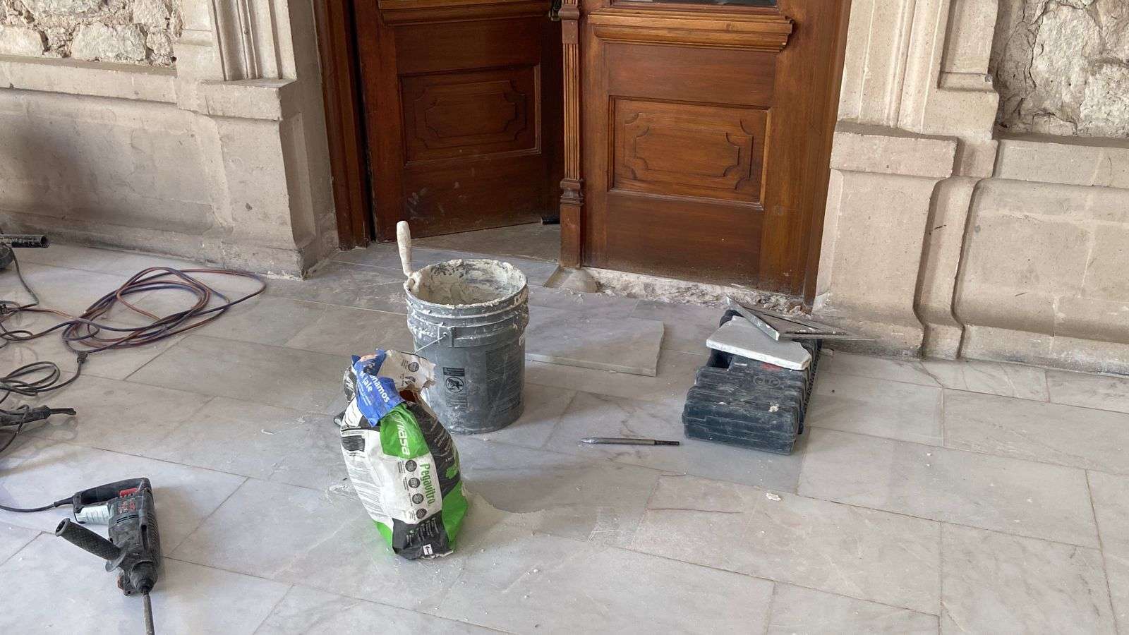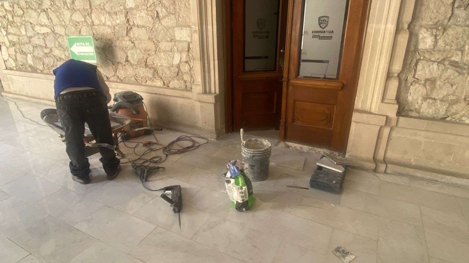 Chihuahua.- En el Palacio de Gobierno, durante estos días de asueto, se aprovecharon las jornadas para reparar las losetas de mármol que se encontraban deterioradas.
