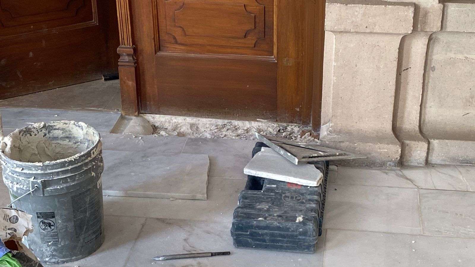 Un trabajador se encargó de reemplazar el piso de mármol que ya estaba roto o en mal estado en los pasillos del edificio de cantera.