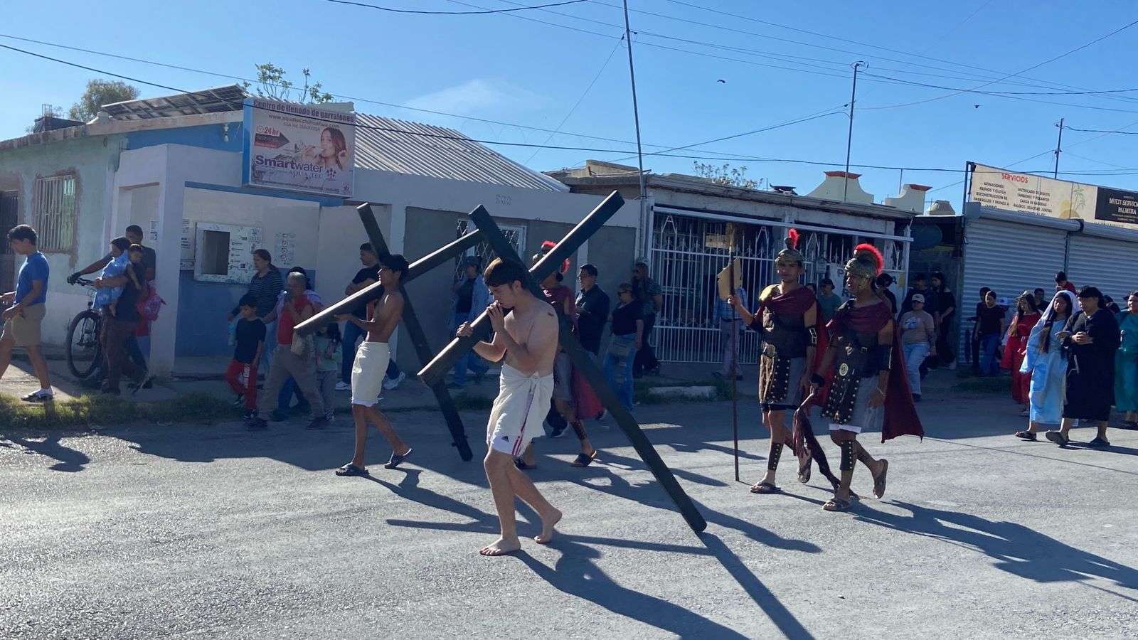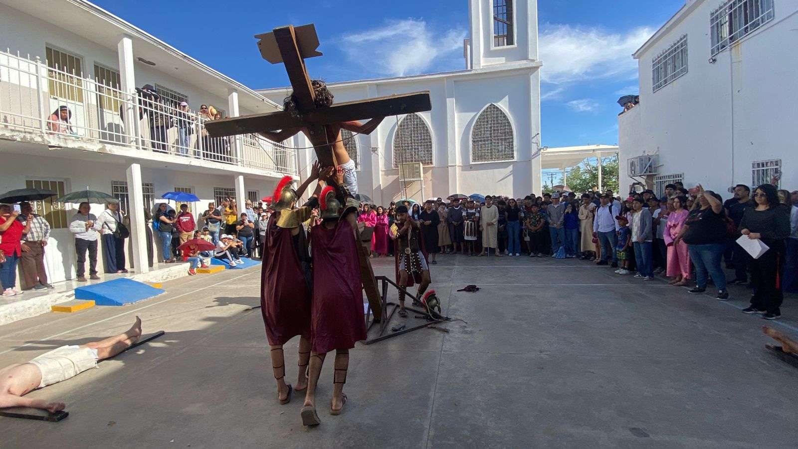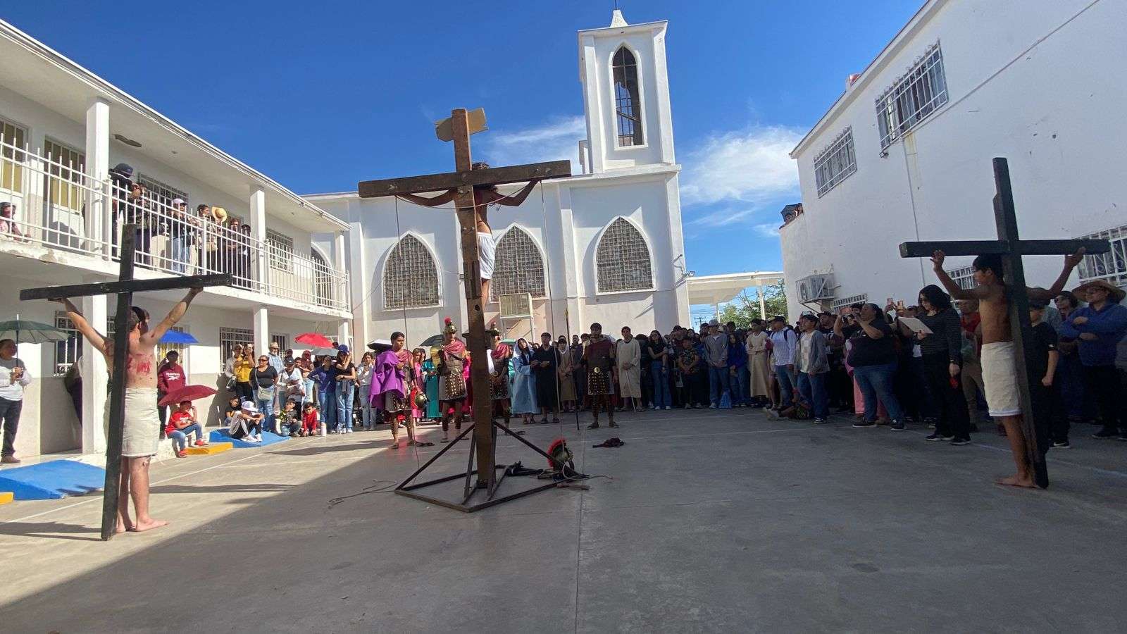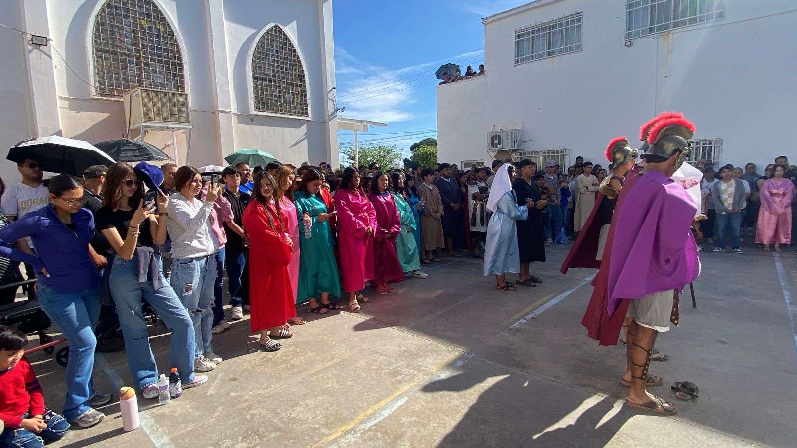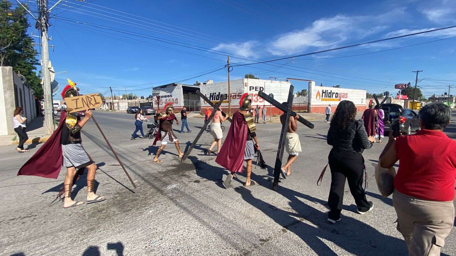 Chihuahua. - En un ambiente de fe y reflexión, este Viernes Santo se llevó a cabo el tradicional viacrucis viviente en la parroquia del Señor de los Guerreros, ubicada en la colonia Villa Juárez.