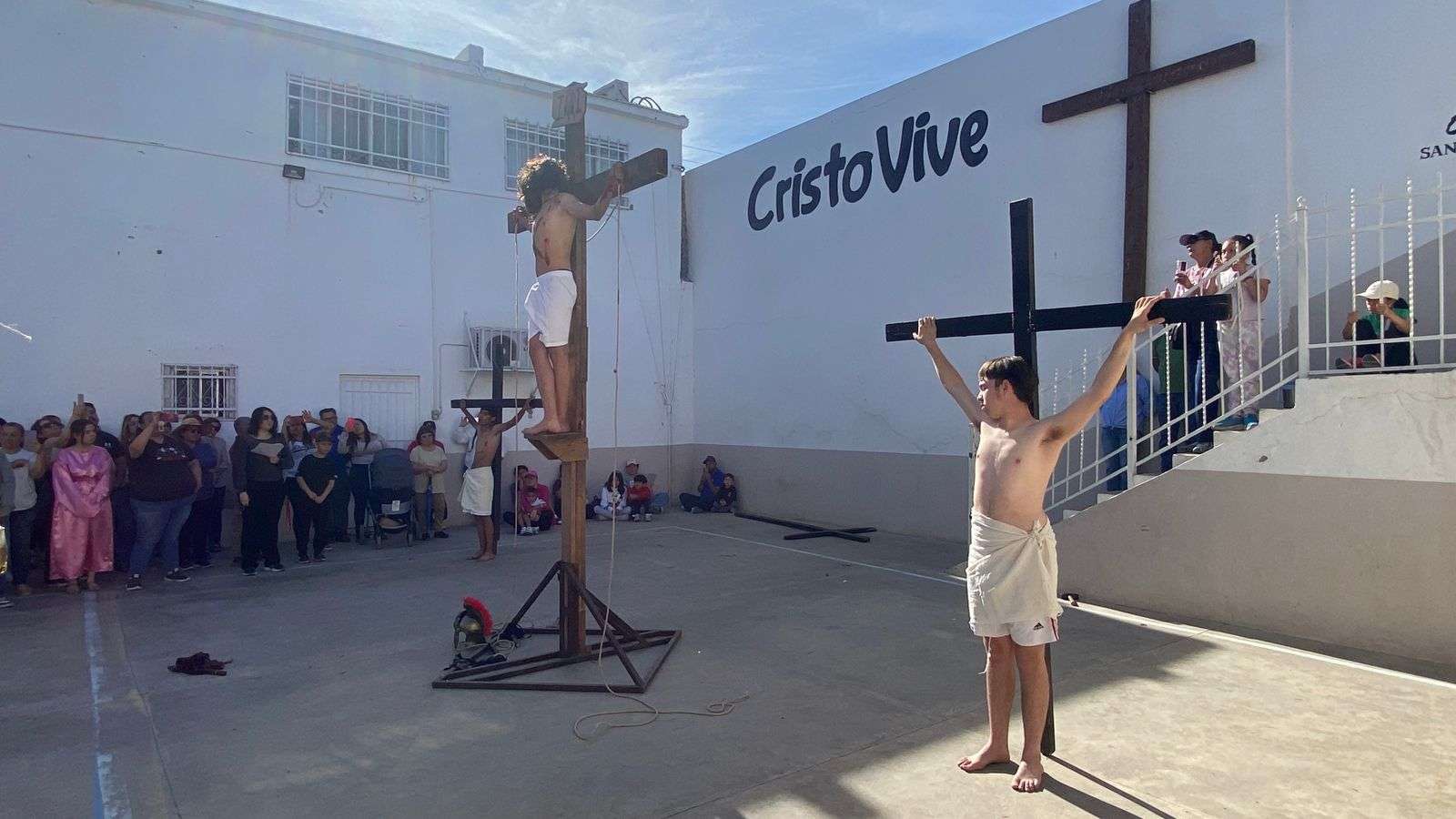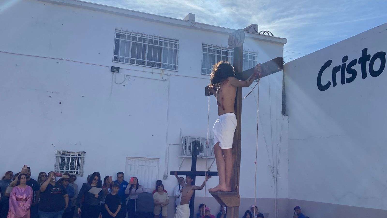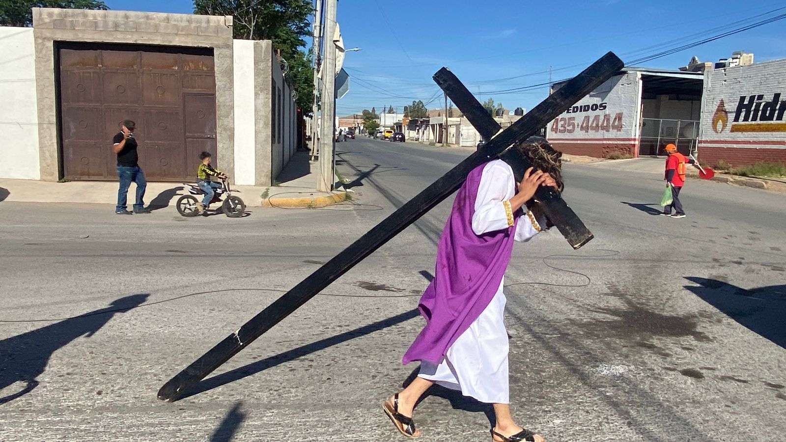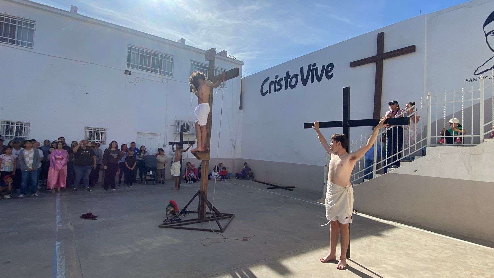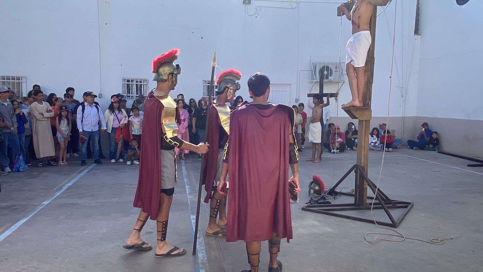 Chihuahua. - En un ambiente de fe y reflexión, este Viernes Santo se llevó a cabo el tradicional viacrucis viviente en la parroquia del Señor de los Guerreros, ubicada en la colonia Villa Juárez.