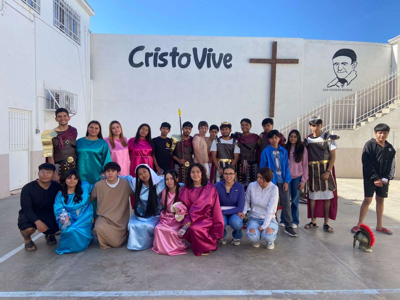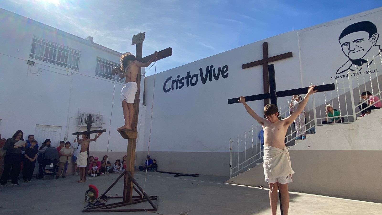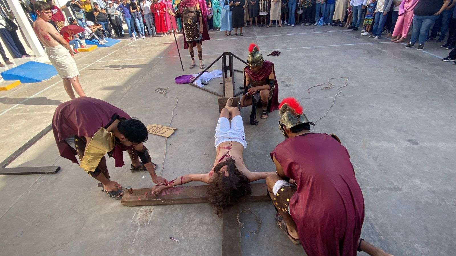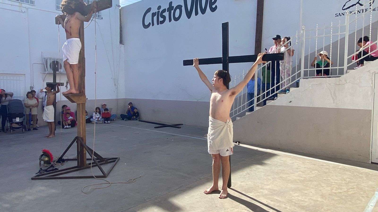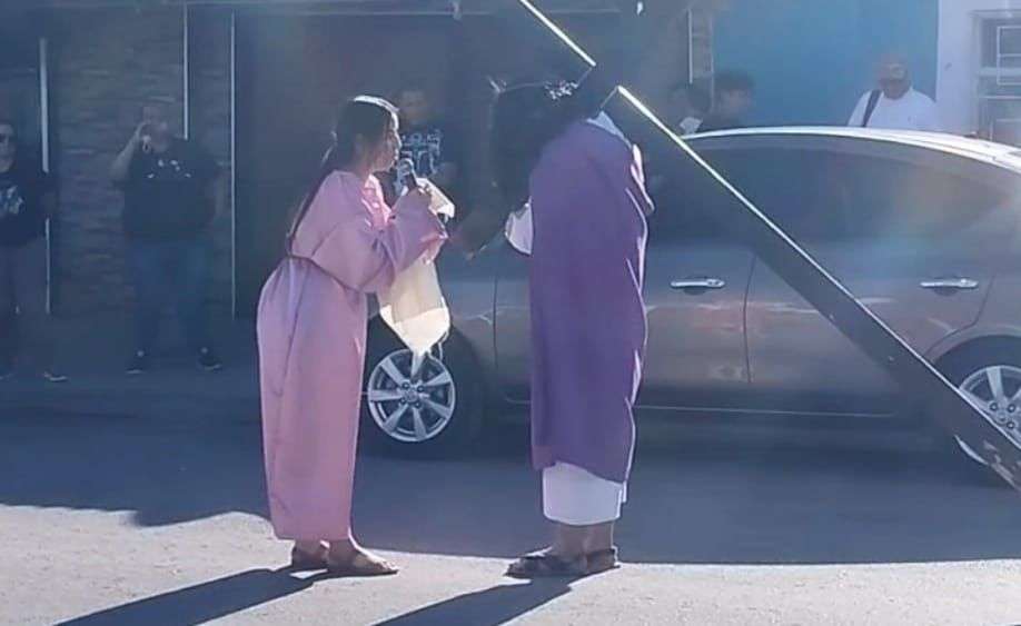 Chihuahua. - En un ambiente de fe y reflexión, este Viernes Santo se llevó a cabo el tradicional viacrucis viviente en la parroquia del Señor de los Guerreros, ubicada en la colonia Villa Juárez.