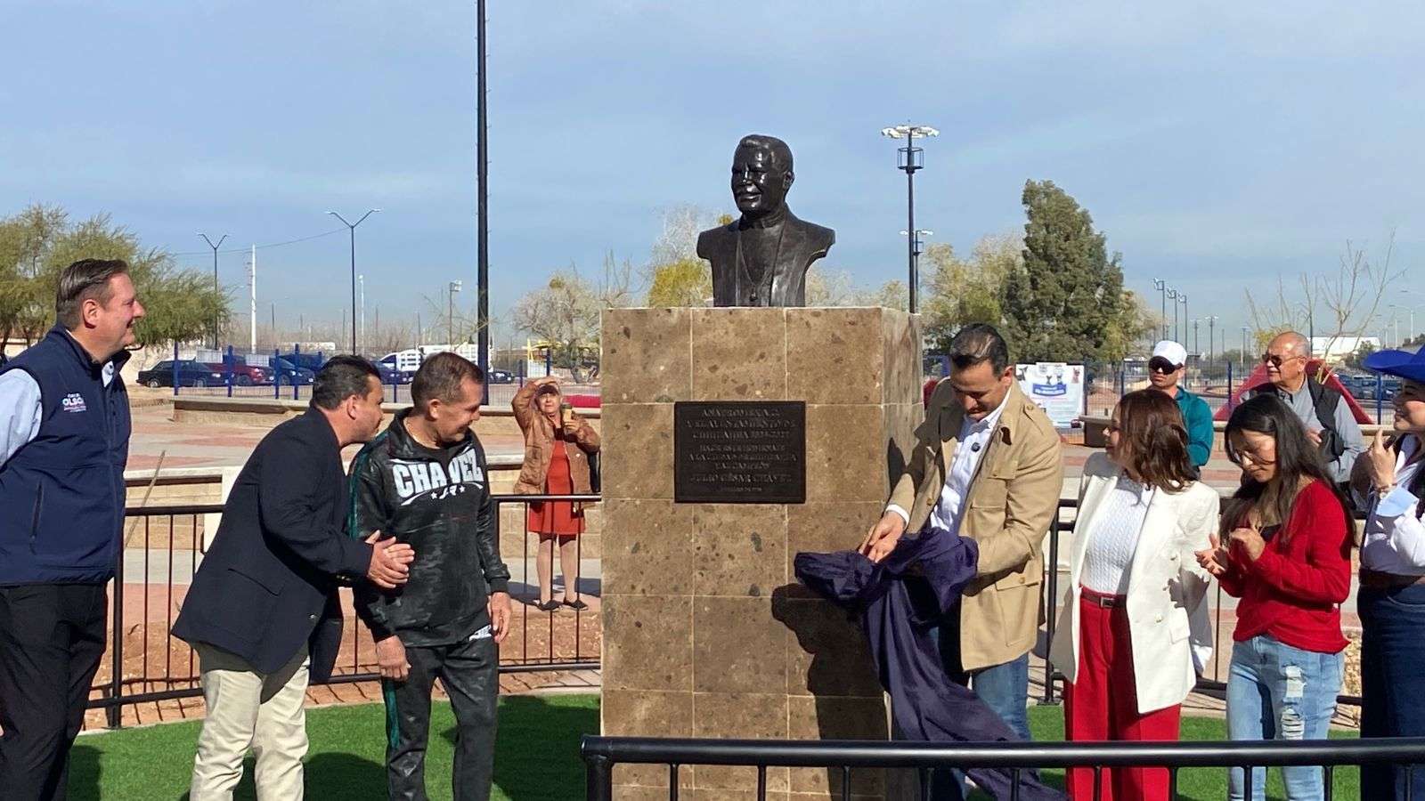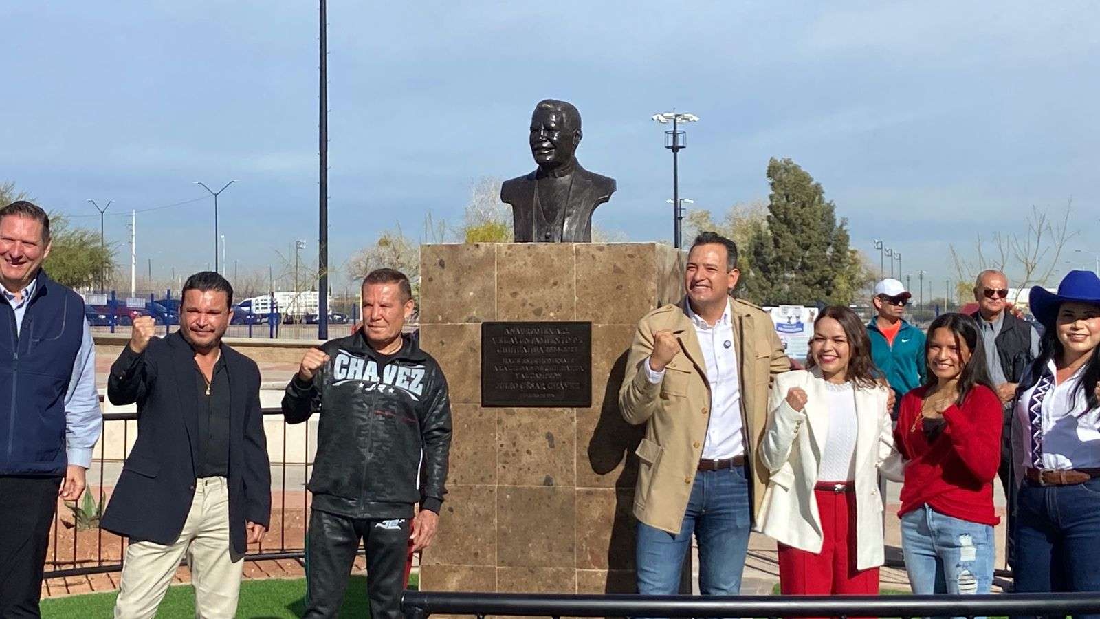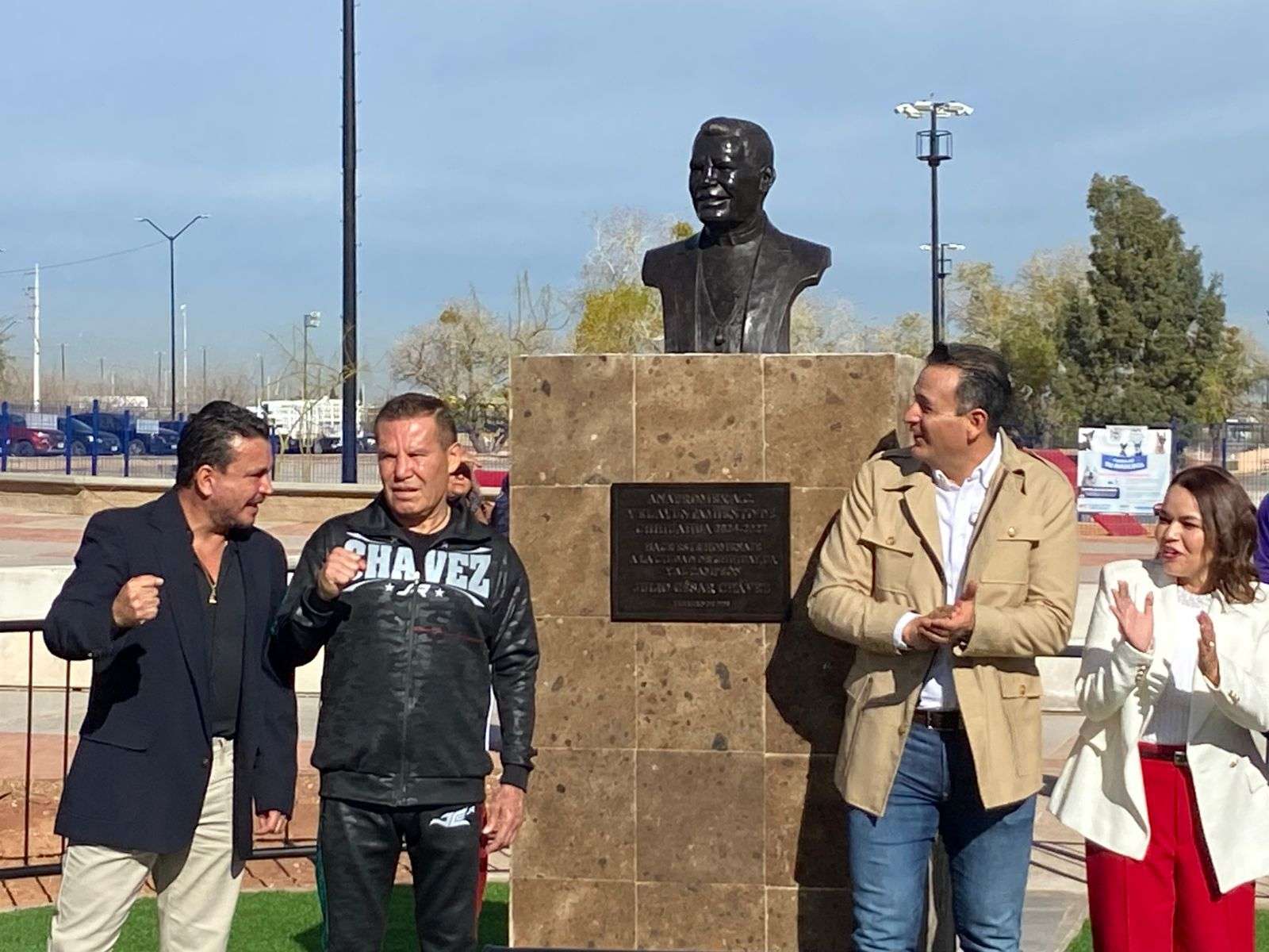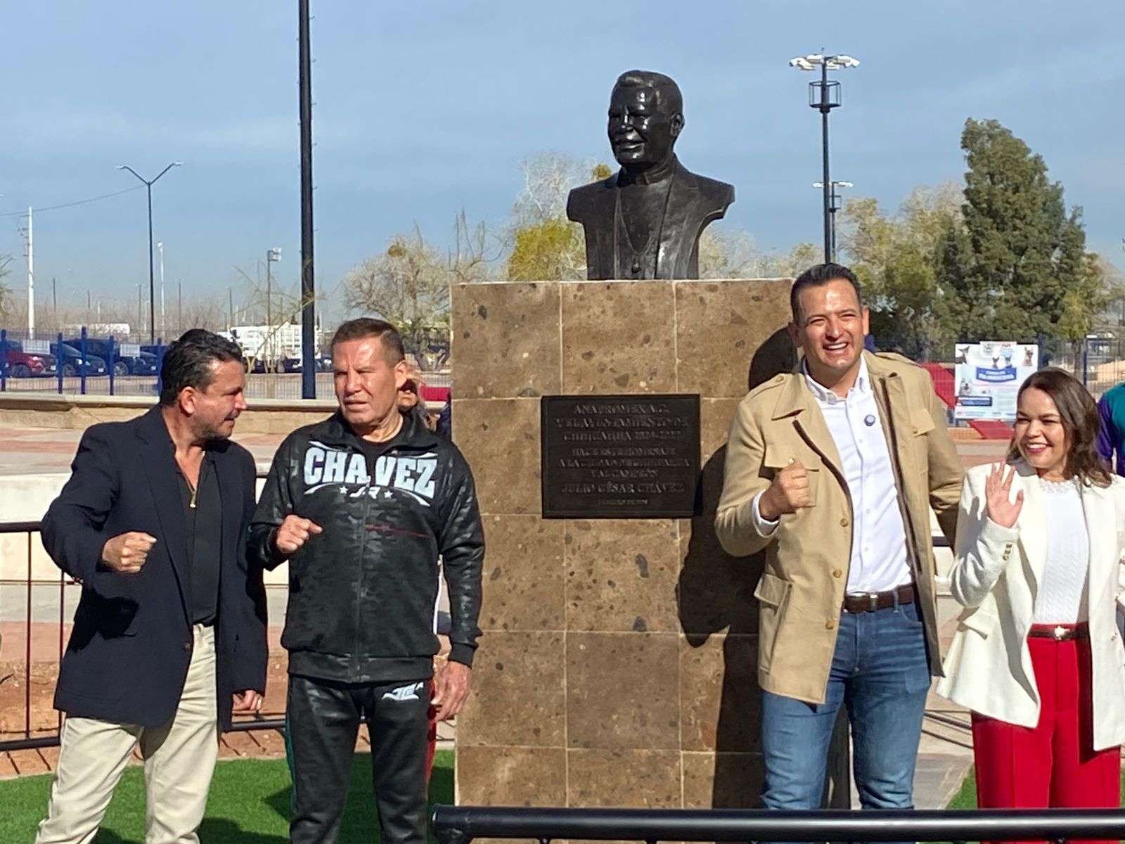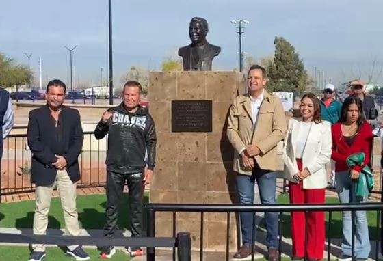 Chihuahua.- El alcalde Marco Antonio Bonilla Mendoza y Julio César Chávez González, el gran campeón mexicano, develaron un busto en su honor por la gran trayectoria en su carrera boxística.