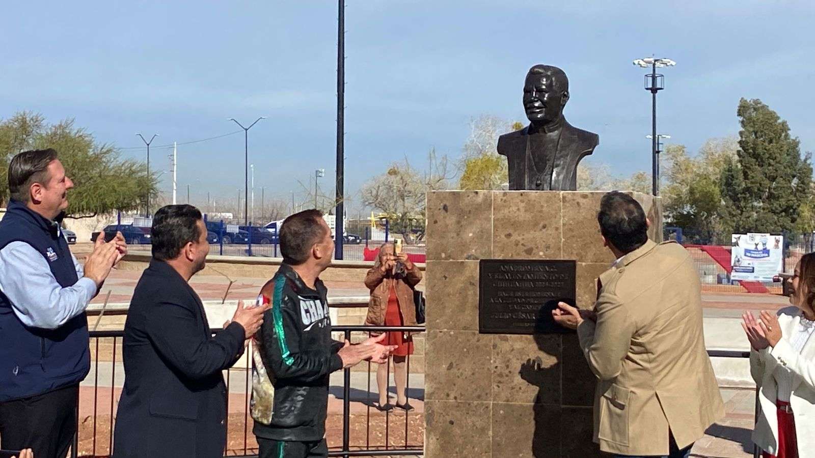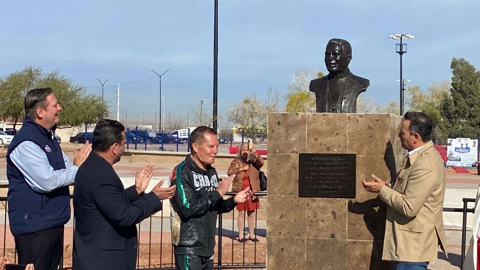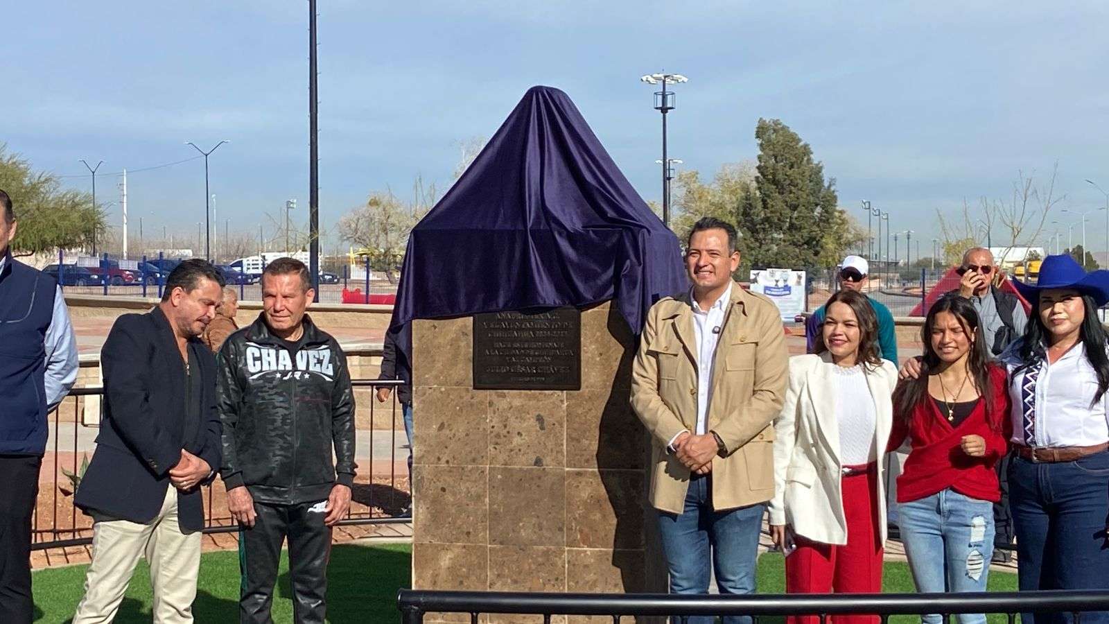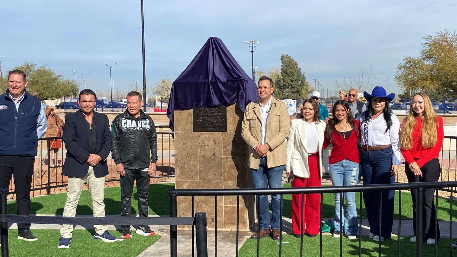 Chihuahua.- El alcalde Marco Antonio Bonilla Mendoza y Julio César Chávez González, el gran campeón mexicano, develaron un busto en su honor por la gran trayectoria en su carrera boxística.