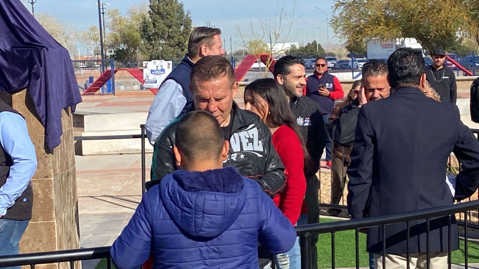 Julio César Chávez, enfundado en una chamarra con la imagen de su hijo, Julio César Chávez Jr., con una gran sonrisa agradeció el homenaje que se le realizó en el Polideportivo Luis H. Álvarez.