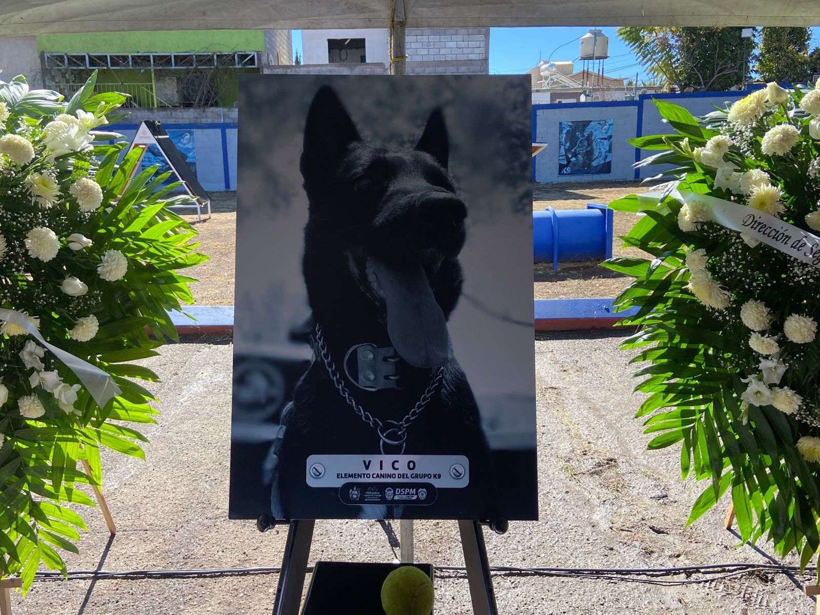 La urna donde descansan sus cenizas fue colocada junto con su correa de adiestramiento y su juguete, acompañada de tres coronas florales colocadas a un costado.