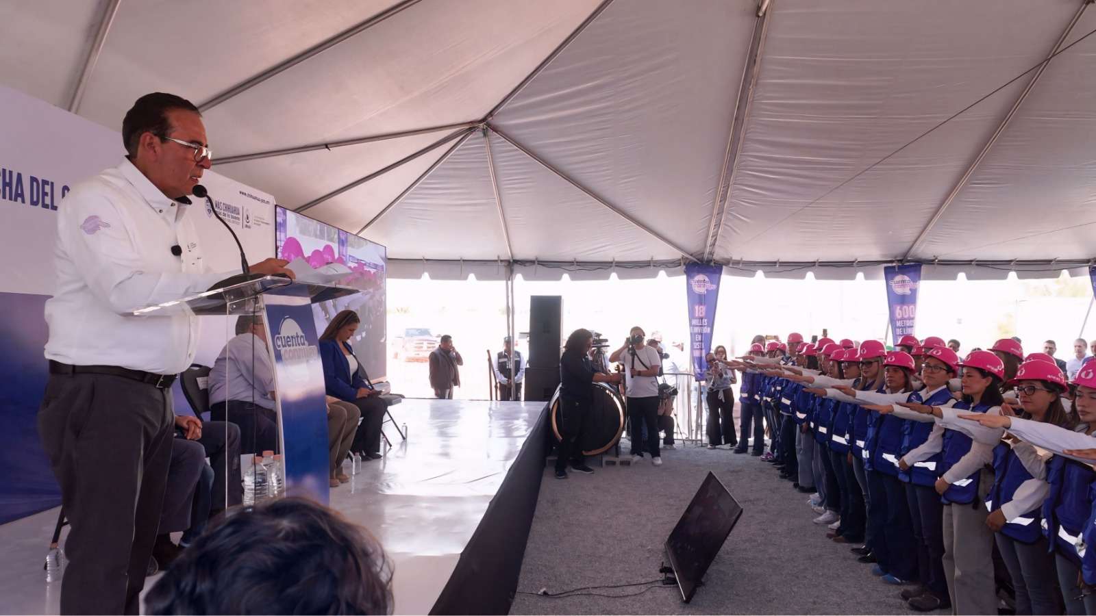 Chihuahua.- En el marco de la inauguración y puesta en marcha del Colector Viñedos, se llevó a cabo la toma de protesta de la primera generación del programa “Cascos Rosas” de la Junta Municipal de Agua y Saneamiento de Juárez (JMAS), integrada por 50 colaboradoras, que impulsan la participación, capacitación y liderazgo de las mujeres en el sector hídrico.
