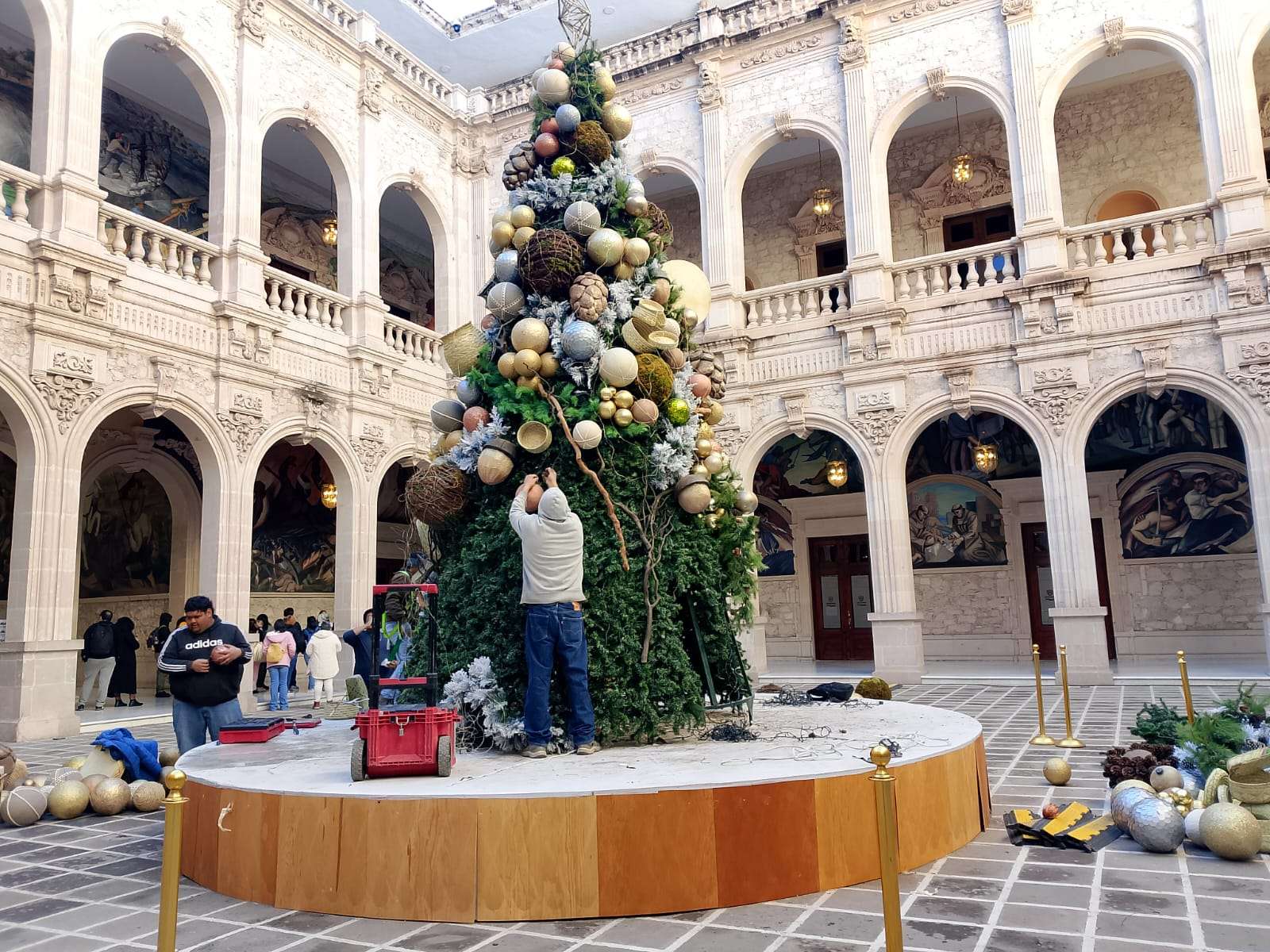 Desde el interior del edificio, personal operativo retiró luces, esferas y la estructura del árbol, que durante varias semanas fue parte del recorrido de visitantes y trabajadores, además de servir como fondo para fotografías y actos protocolarios.
