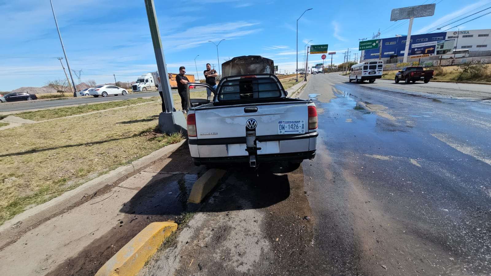 De acuerdo con el conductor, quien tripulaba una pickup Volkswagen Pointer de color gris, mientras avanzaba por la vialidad sintió un “jalón” en la unidad, por lo que decidió detenerse para revisar la falla. Al descender del vehículo, comenzó a salir fuego del área del motor.