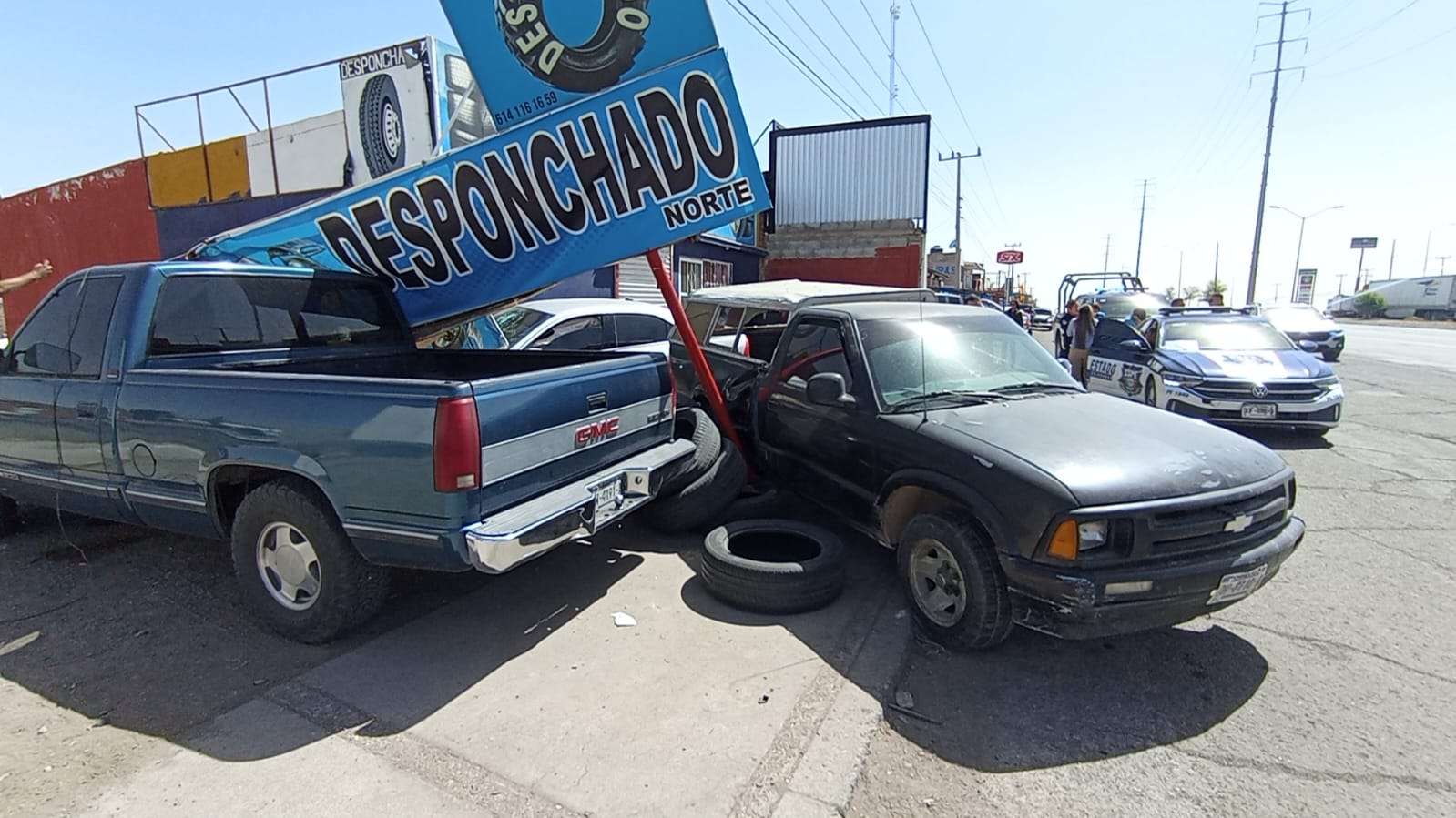 Durante el impacto, las unidades chocaron contra un anuncio del desponchado, donde el trabajador realizaba labores mecánicas, por lo que fue atropellado y cayó a un barranco de aproximadamente tres metros de profundidad. En el lugar también resultó con daños una pickup GMC Sierra estacionada.