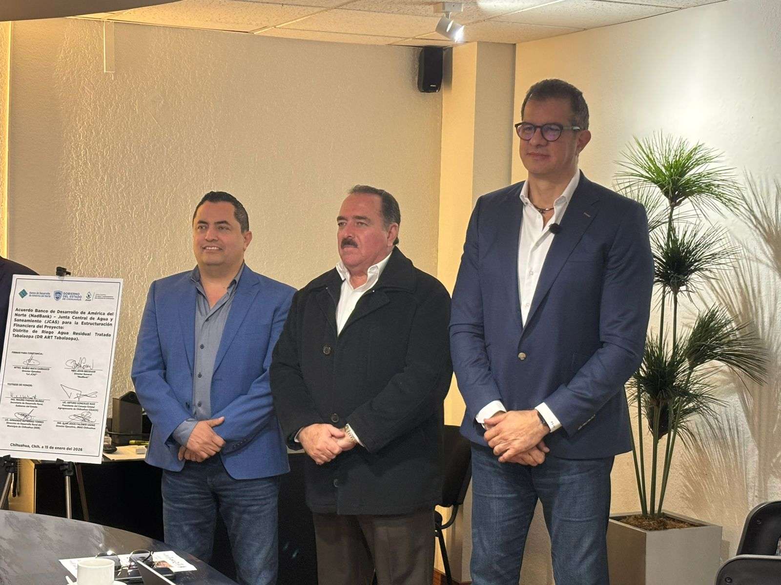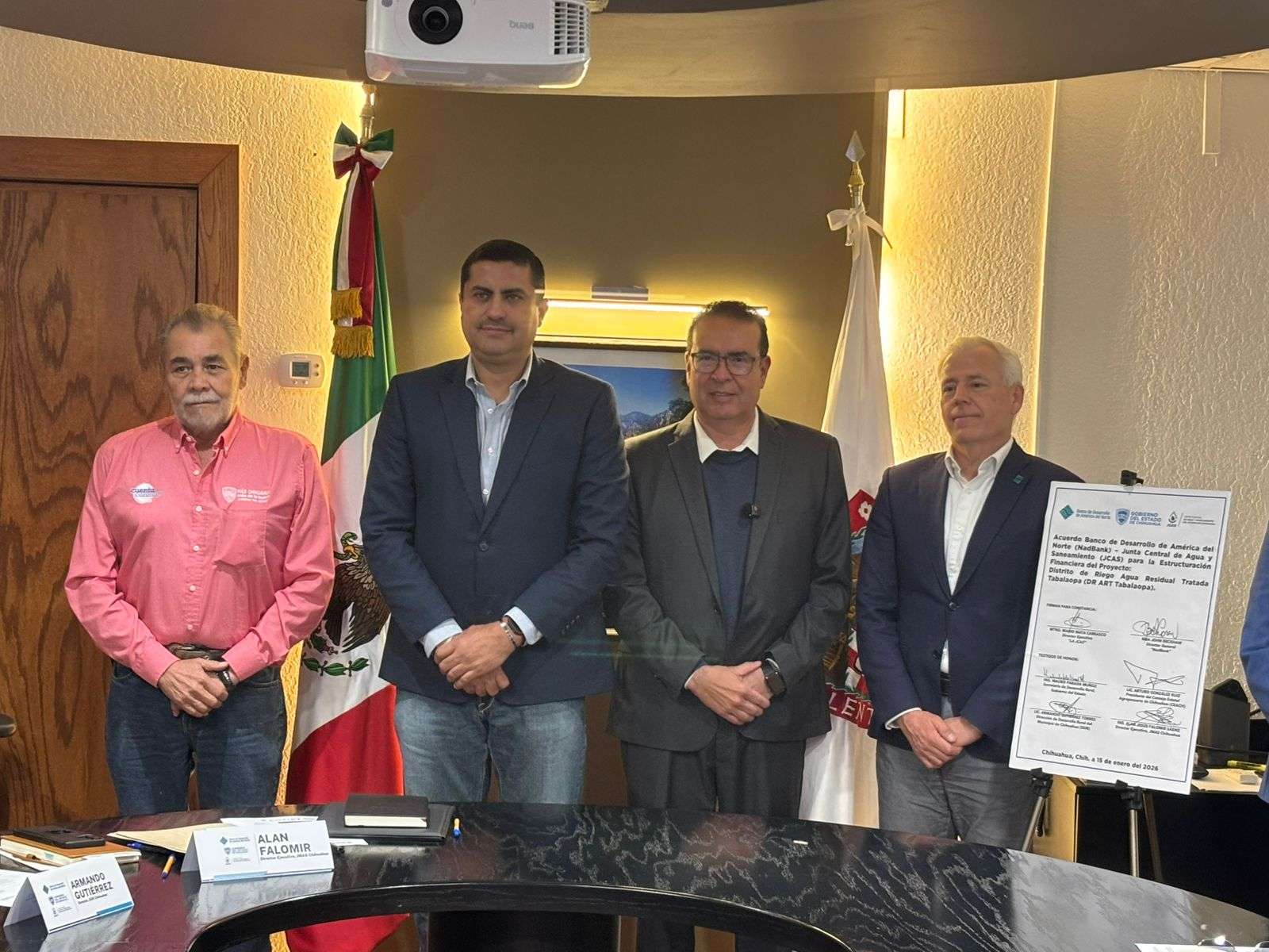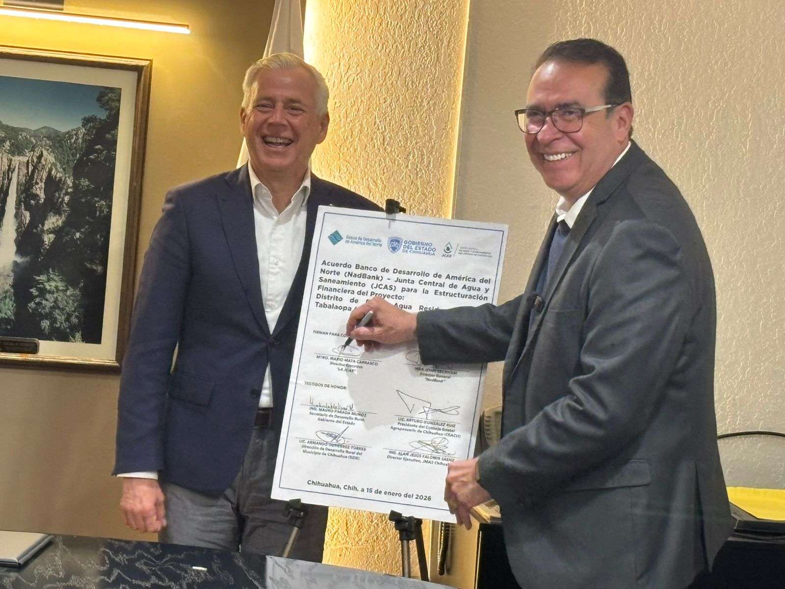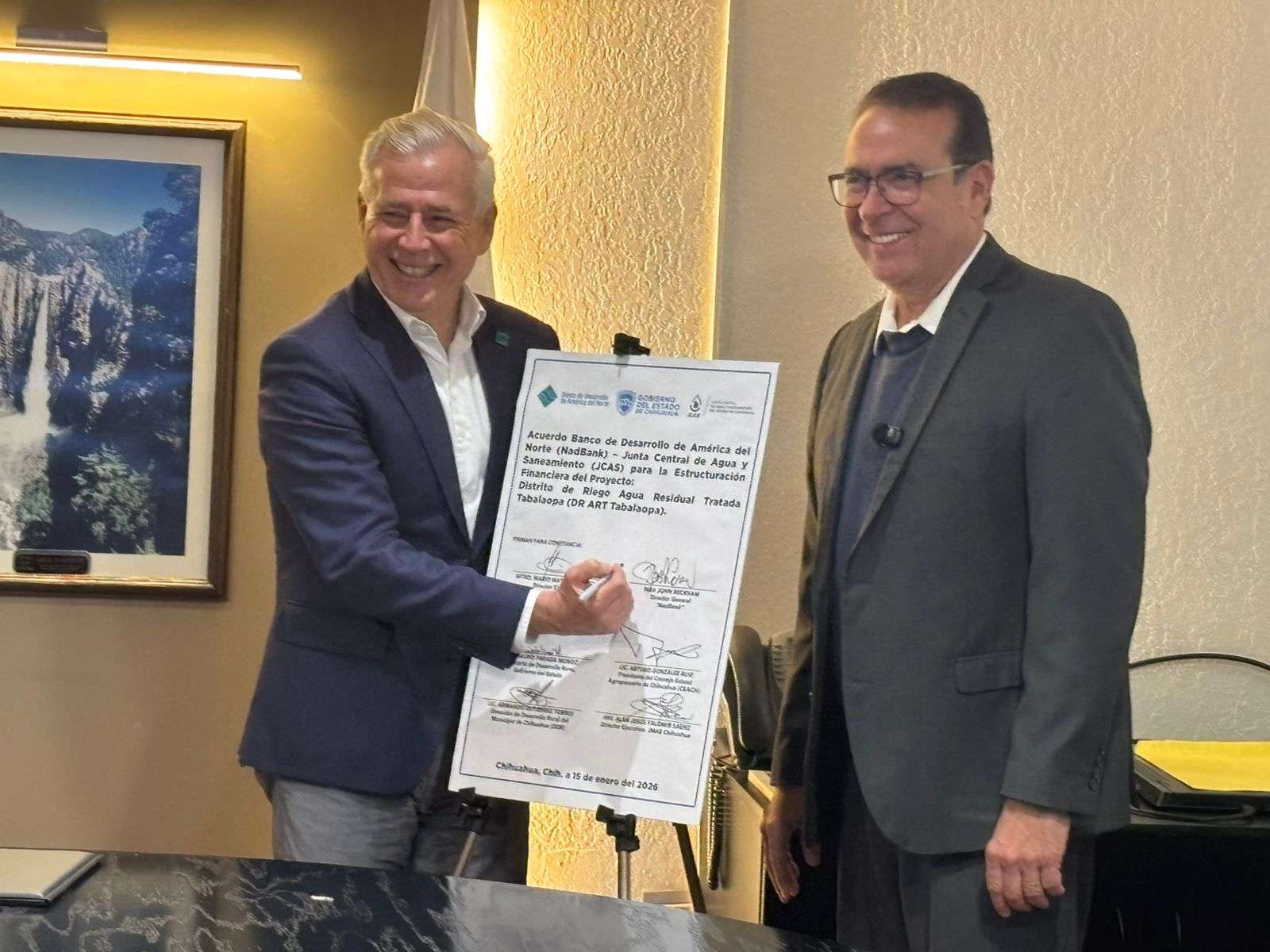 Chihuahua, Chih.– Este miércoles se firmó un convenio de colaboración para brindar asesoría técnica y financiera al proyecto de Mejoras en el Distrito de Riego Tabalaopa, entre el director de la Junta Central de Agua y Saneamiento, Mario Mata Carrasco, y el director general del NadBank, John Beckham.