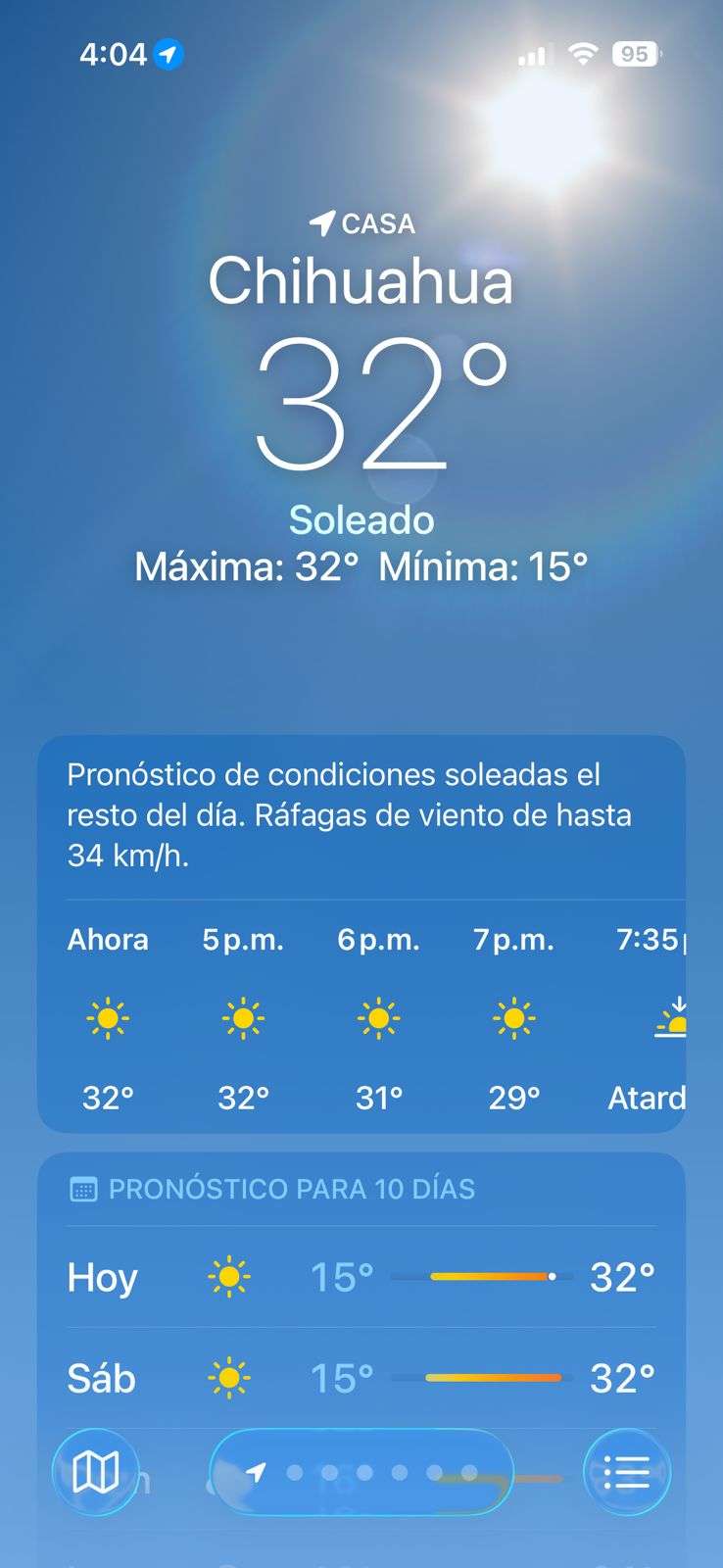 Chihuahua.- En el inicio de este fin de semana, la capital del estado registró una tarde calurosa con temperaturas que alcanzaron los 32 grados centígrados bajo un cielo totalmente despejado. Las condiciones climáticas incluyen vientos de 16 kilómetros por hora, con ráfagas que podrían alcanzar los 34 kilómetros por hora durante el resto de la jornada.