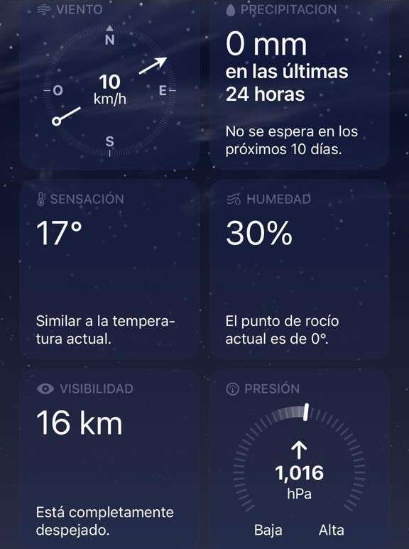 El porcentaje de humedad arrojó un promedio del 30% por ciento, una presión de 1.016, sin probabilidad de lluvias y una visibilidad de 16 kilómetros.