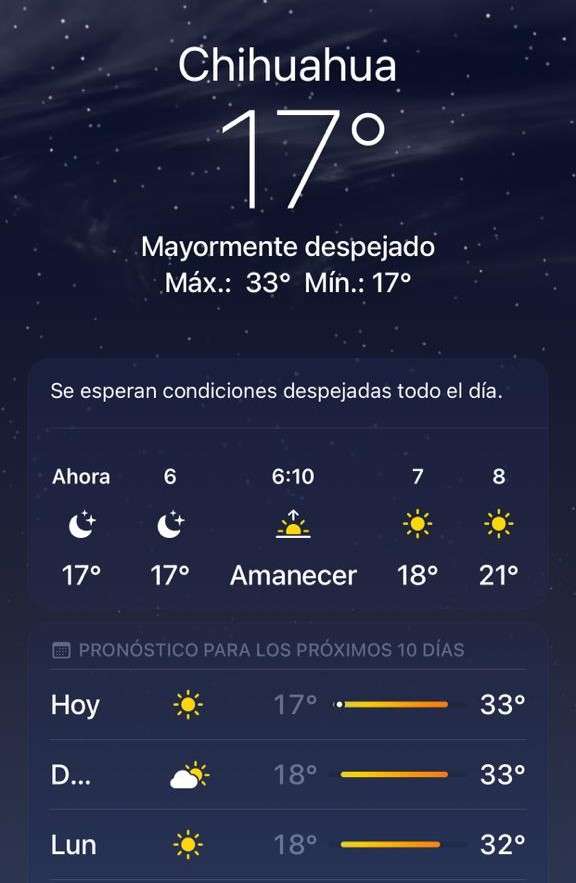 Chihuahua.- Al inicio del día por la mañana se tuvo una temperatura de 17 grados Celsius, por lo que hubo un leve descenso a comparación del día de ayer y un ambiente fresco en la ciudad.