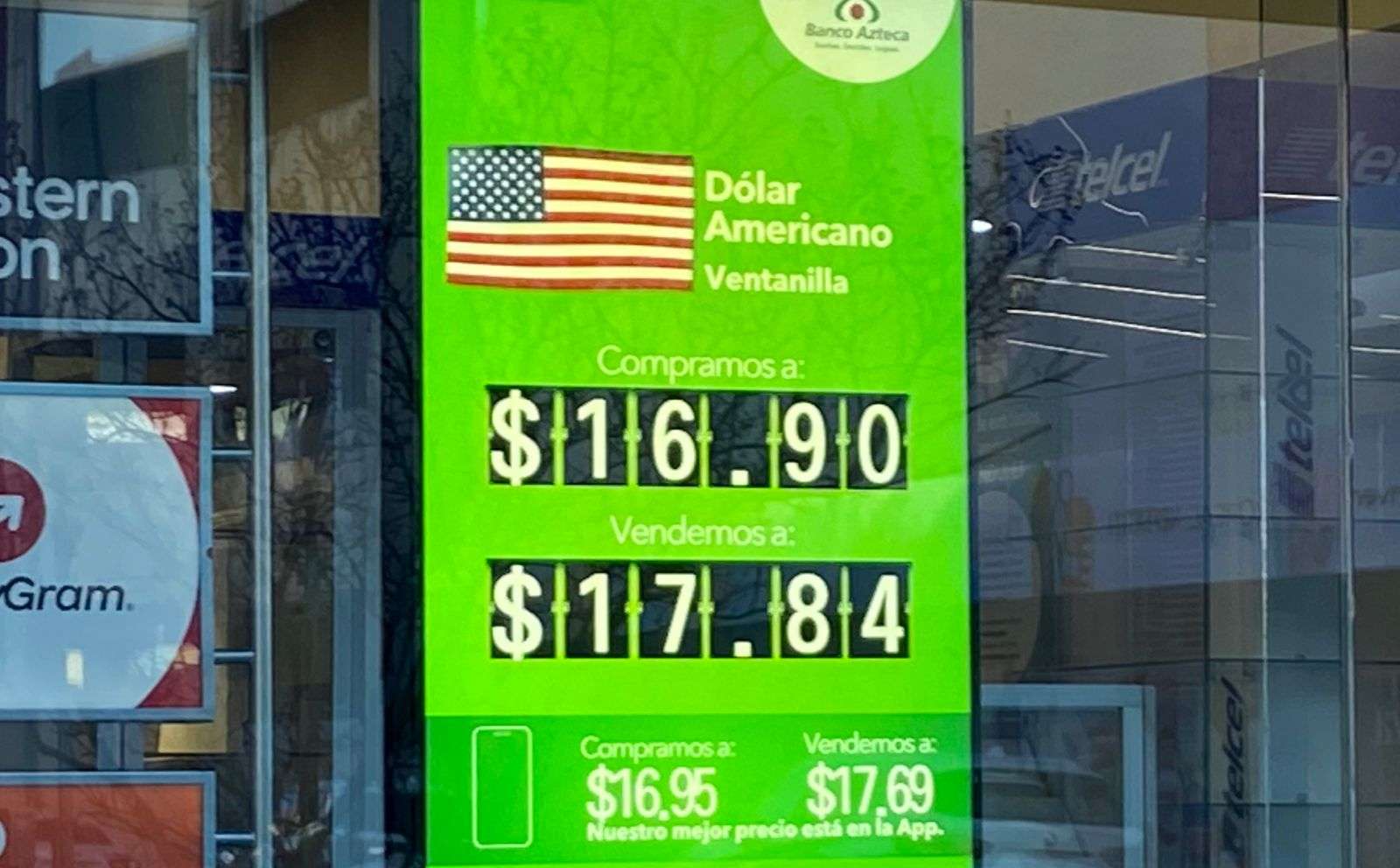 Chihuahua.- En ventanillas de Banco Azteca, ubicada en la calle Cuarta y Aldama el dólar subió a $17.84 a la venta y de $16.90 a la compra, por lo que el tipo de cambio registró un alza.
