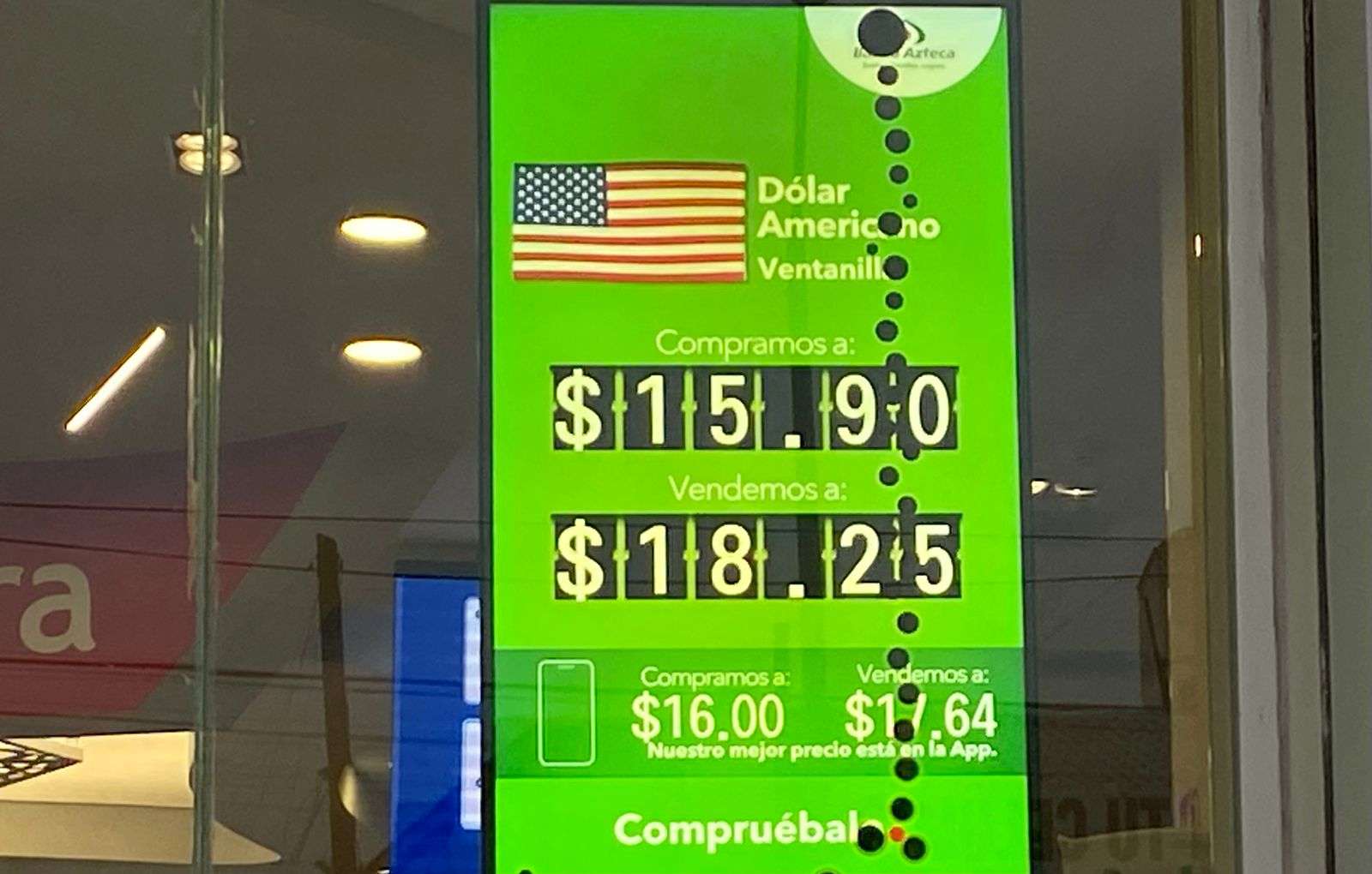 Chihuahua.– El dólar estadounidense para este lunes 9 de febrero subió a $18.25 a la venta y a $15.90 a la compra en ventanillas de Banco Azteca, ubicado en Niños Héroes y calle Quinta, en el centro de la ciudad.