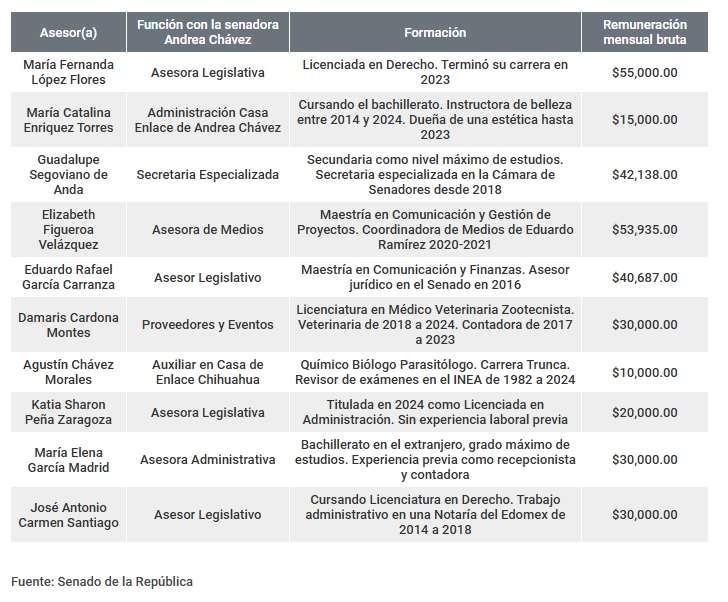 La Unidad de Datos del periódico SinEmbargo ubicó las declaraciones patrimoniales de 10 personas contratadas por el Senado como sus asesores, que mencionaron como su “área de adscripción” el escaño de Chávez, con funciones que van desde la asesoría en temas legislativos hasta ayudarle con el trabajo de “proveedores y eventos”.