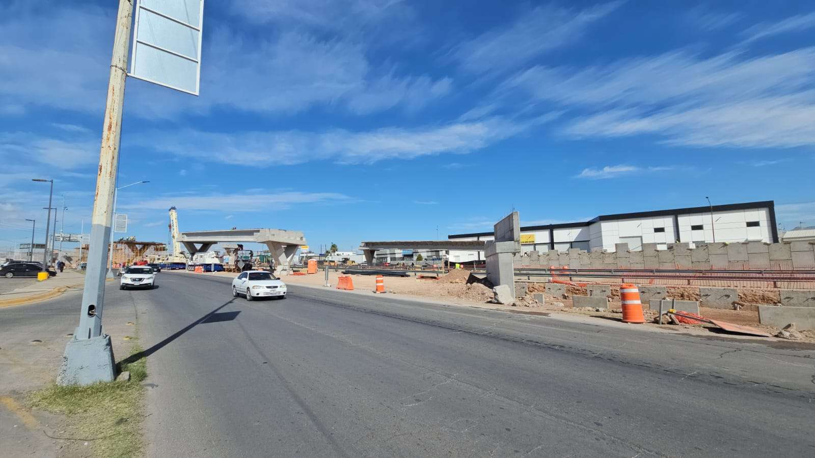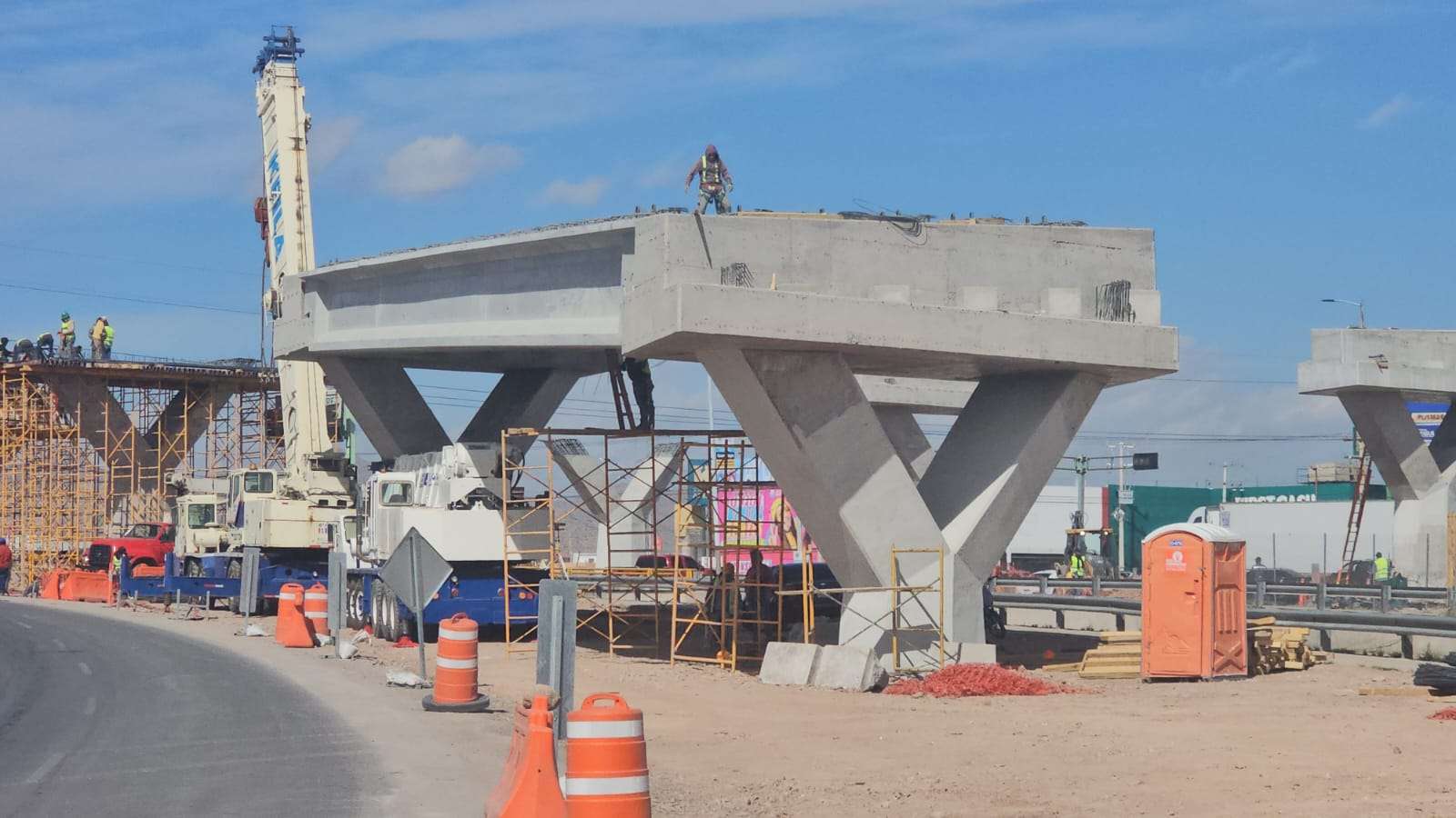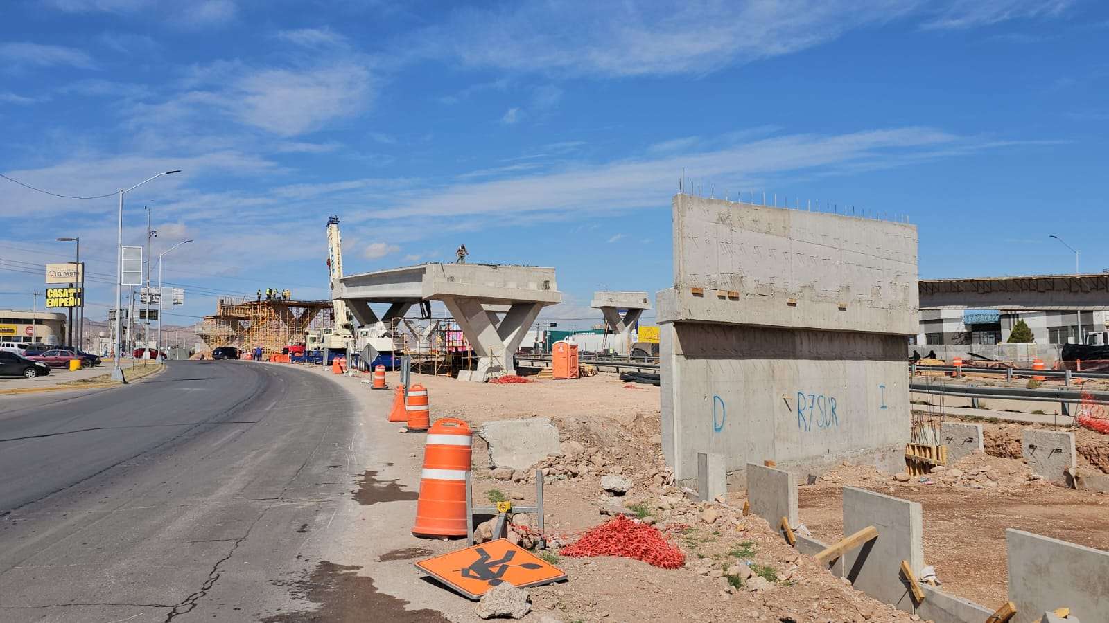 Chihuahua.– La construcción del puente superior en la Vialidad Los Nogales registra un avance significativo con la edificación de los pilares que sostendrán la parte más alta de la estructura.