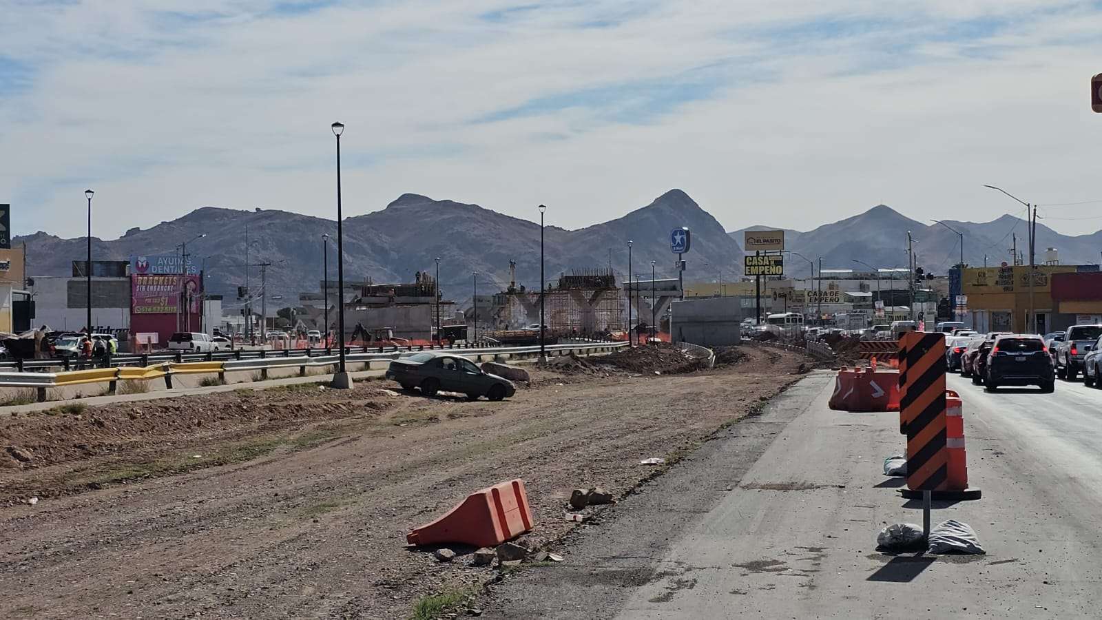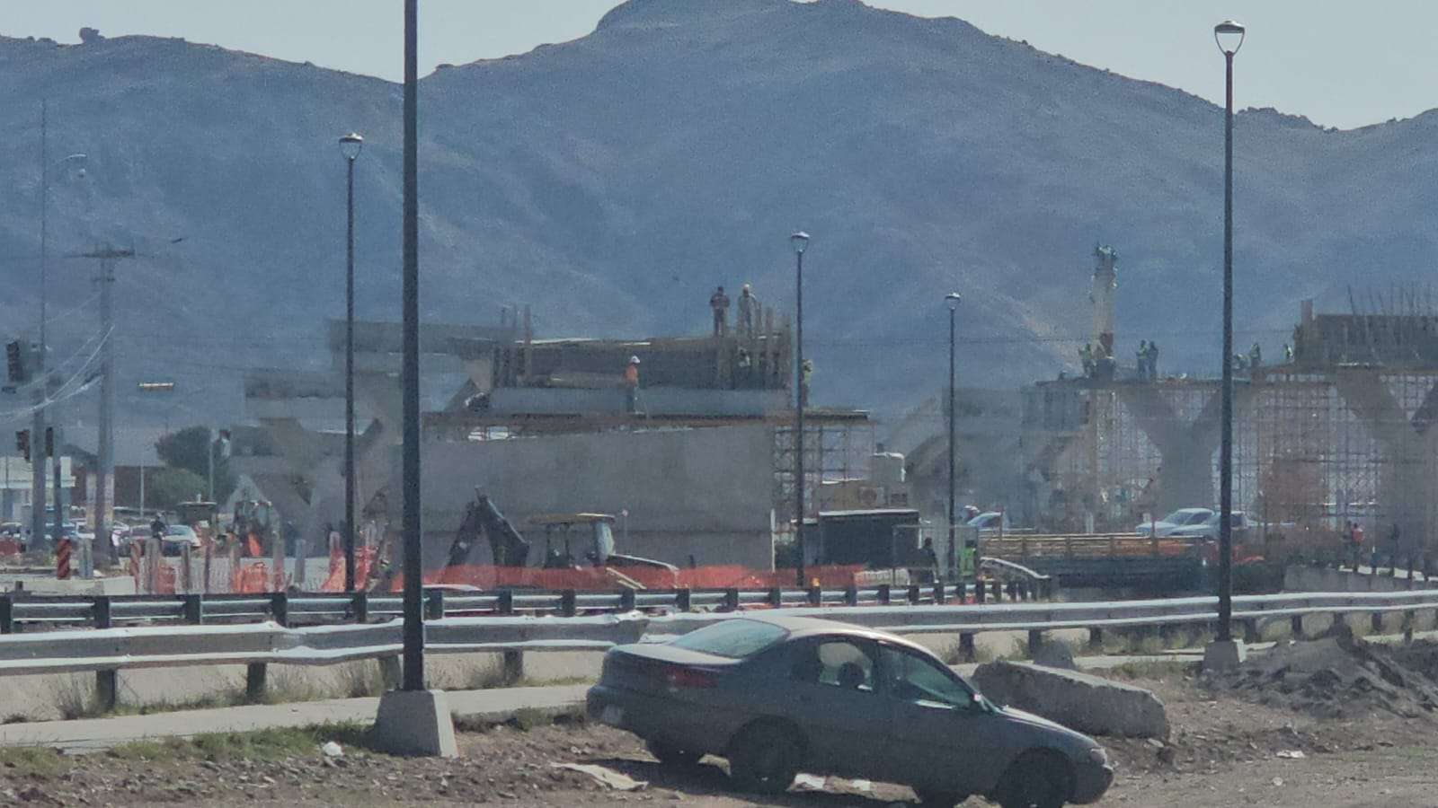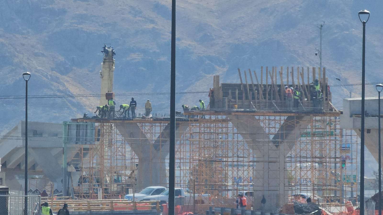 Chihuahua.– La construcción del puente superior en la Vialidad Los Nogales registra un avance significativo con la edificación de los pilares que sostendrán la parte más alta de la estructura.