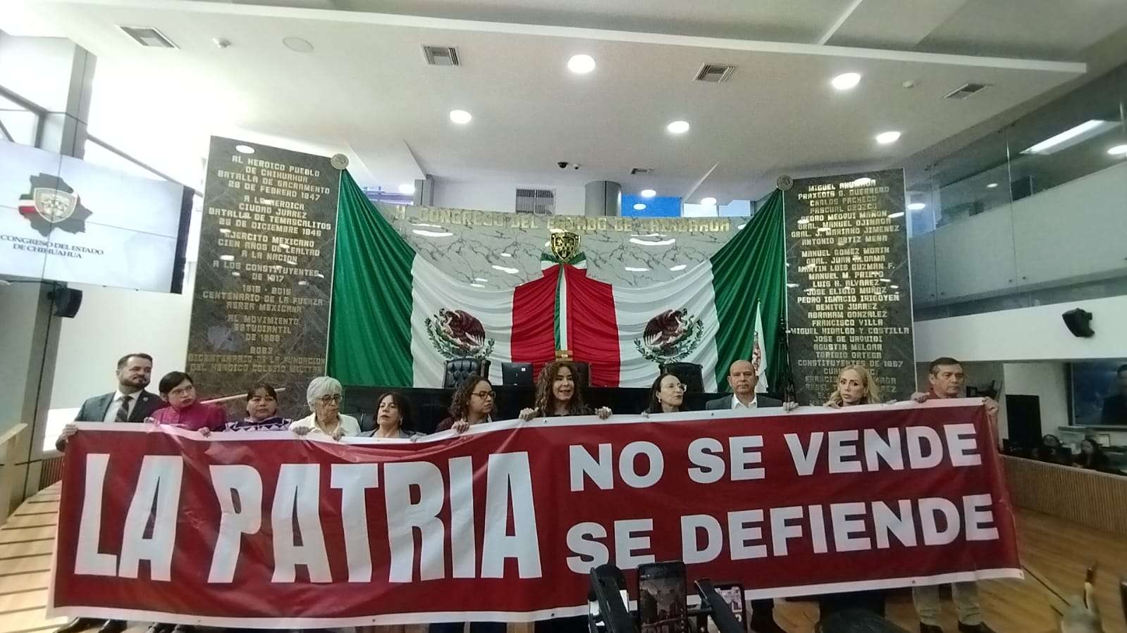 Chihuahua.– Durante la sesión del Congreso del Estado, la bancada de Morena se presentó en la tribuna con una pancarta con la leyenda: “La patria no se vende se defiende”, como posicionamiento político durante los trabajos legislativos de este jueves.