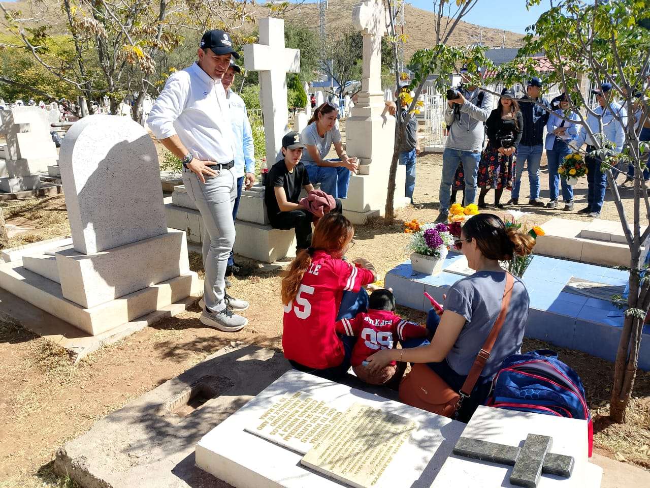 Chihuahua.- El alcalde Marco Bonilla realizó un recorrido por los panteones municipales durante la Feria del Hueso, donde supervisó operativos y convivencia de familias que acudieron a honrar a sus difuntos, para concluir en el Panteón Municipal Número 1, donde descansan sus familiares.