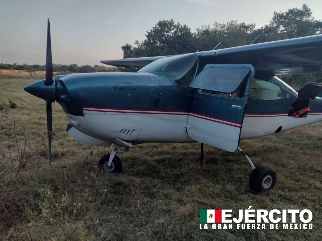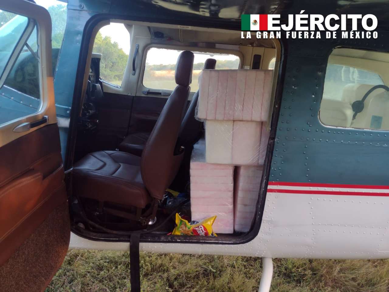 En las fotografías que publicó la SEDENA junto con el breve informe, se observó una avioneta Cessna de color azul marino con blanco, a la cual no se le vio la matrícula.