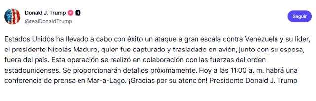 “Estados Unidos ha llevado a cabo con éxito un ataque a gran escala contra Venezuela y su líder, el presidente Nicolás Maduro, fue capturado y trasladado en avión junto con su esposa, fuera del país”, escribió en un mensaje en su red Truth Social.
