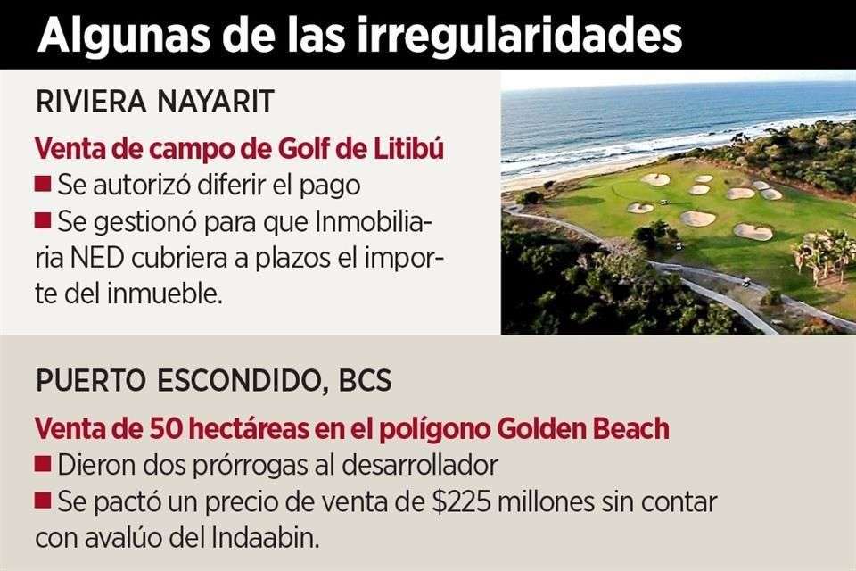 Destaca la venta de 50 hectáreas en el polígono denominado Golden Beach, en Puerto Escondido, Baja California Sur, en donde el ex director de Comercialización, Ricardo Ampudia, otorgó dos prórrogas al desarrollador, además de que pactó un precio de venta de 225 millones de pesos sin contar con el avalúo del Instituto de Administración y Avalúos de Bienes Nacionales (Indaabin).