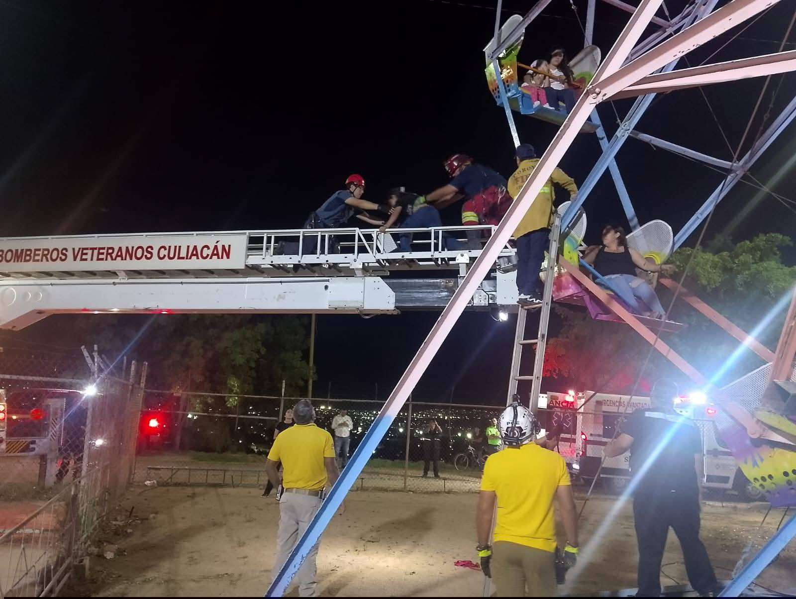 Fue minutos después de las 19:00 horas de la noche de este sábado cuando se reportó a las autoridades personas atrapadas en la rueda de la fortuna por falla mecánica y tras el reporte al lugar se movilizaron elementos de Bomberos Veteranos Culiacán, personal de Protección Civil del Estado y del Municipio, así como paramédicos del Centro Regulador de Urgencias Médicas (CRUM).