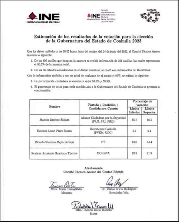 El candidato de la alianza Pri-Pan-Prd a la gubernatura de Coahuila, Manolo Jiménez, aventaja el conteo rápido con un margen de 55.7 a 58.1% de los votos.