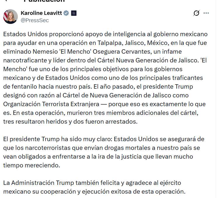 En una publicación en X, la vocera de la Casa Blanca, Karoline Leavitt, dijo que “Estados Unidos proporcionó apoyo en materia de inteligencia al Gobierno mexicano para ayudar en una operación en Tapalpa, Jalisco, en la que fue eliminado Nemesio "El Mencho" Oseguera Cervantes”.