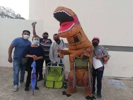 Tamaulipas.- Como una forma de apoyar a su mamá para que acudiera a vacunarse contra el Covid-19, un joven decidió vestirse de dinosaurio y hacer fila en uno de los centros de atención de Ciudad Madero.